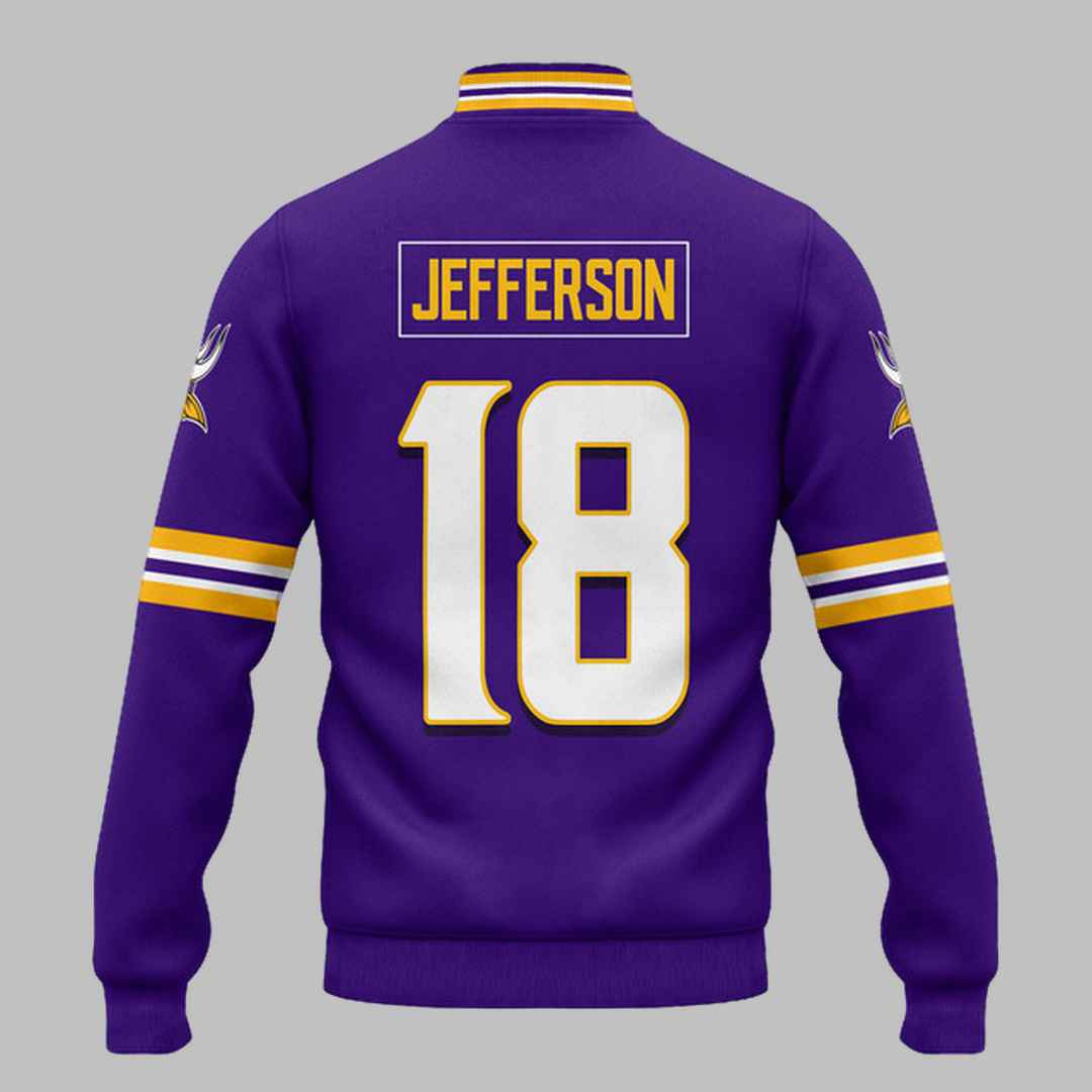 The “18 Minnesota Football Unisex Jacket” is a perfect combination of sporty style and premium quality. Made with high-grade materials, this jacket offers a warm, comfortable fit, ideal for those chilly game days. Its bold purple design, highlighted by the iconic number 18 and “Jefferson” on the back, ensures you’ll stand out in the crowd as a true Vikings supporter.