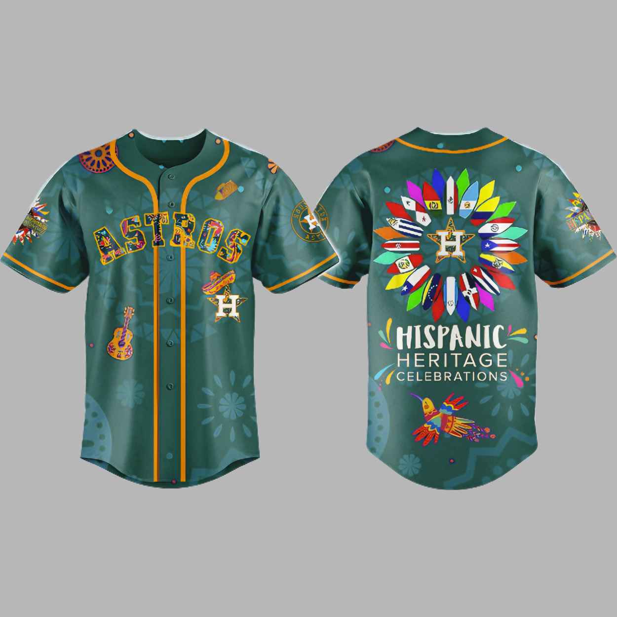 The front of the jersey has a stylized “ASTROS” script in a yellow and orange font with a subtle, all-over pattern of geometric shapes and swirls, reminiscent of traditional folk art. The front also includes a mariachi-hat-wearing logo and a guitar graphic, adding a touch of cultural flair. The jersey is trimmed with orange piping and has a classic button-up front. The back of the jersey is where the true celebration shines. It features a large circular design, a “flower” made of the flags of various Latin American and Caribbean countries, all surrounding a central “H” logo. Below the graphic, the words “HISPANIC HERITAGE CELEBRATIONS” are printed, along with a colorful hummingbird.
