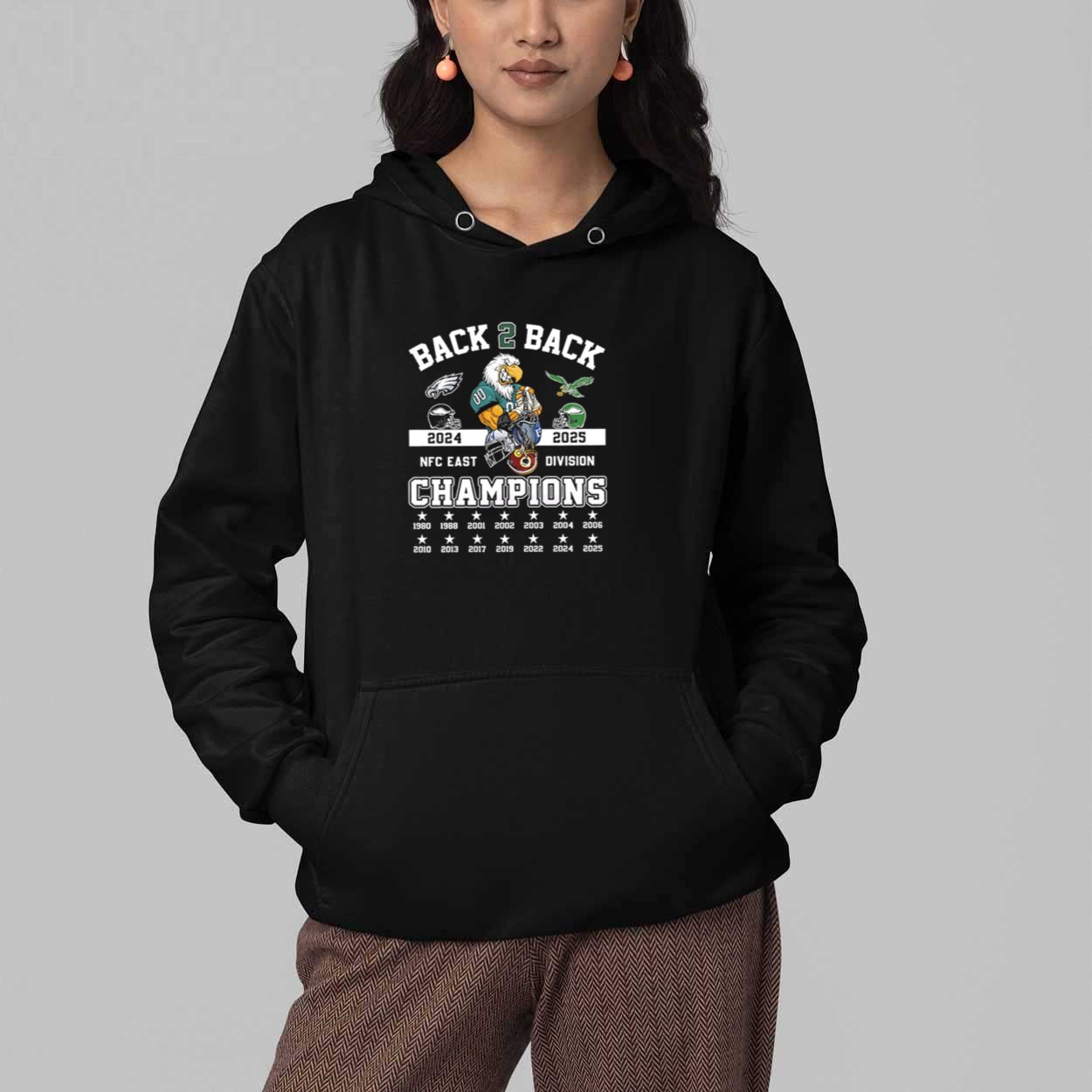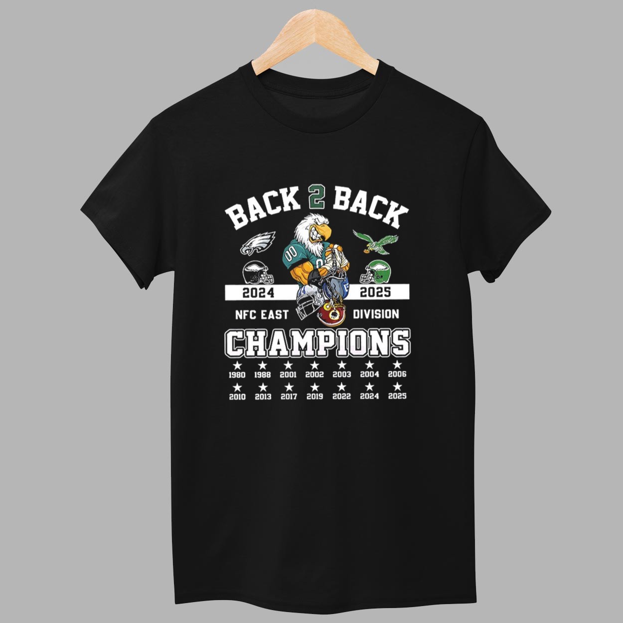 This sleek black t-shirt features a detailed graphic design that celebrates the team’s consecutive reign at the top of the division. The front displays an aggressive eagle mascot holding conquered helmets, flanked by the “2024” and “2025” milestone years. Below the central “CHAMPIONS” declaration, a field of stars lists every year of victory, from 1980 to the most recent 2025 triumph. This apparel is more than just a piece of clothing; it is a wearable timeline of excellence, symbolizing the grit, consistency, and enduring power of the franchise. By wearing this shirt, you are honoring a legacy of winning and standing with the team as they continue to rule the East.