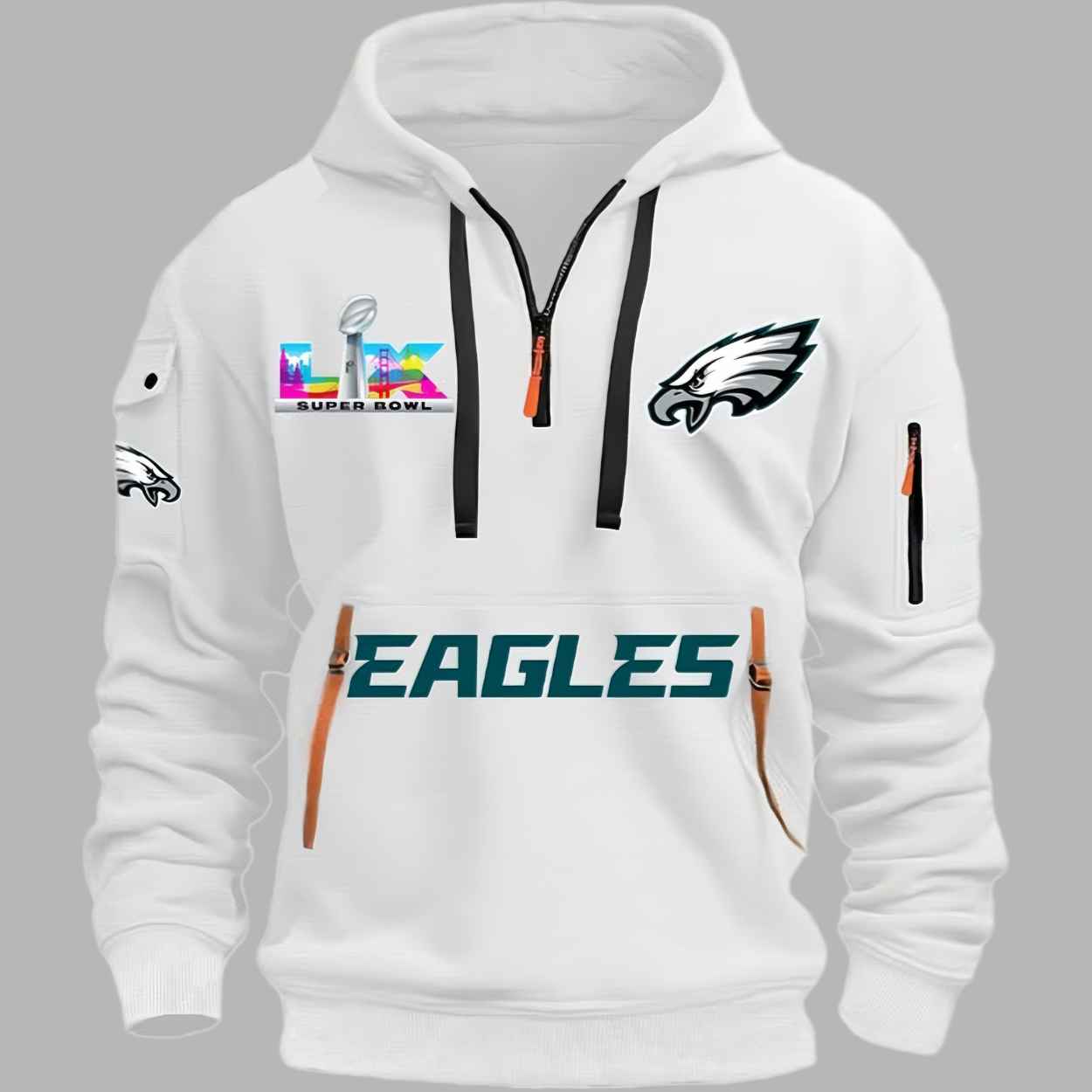 This white hoodie features a clean, professional aesthetic with modern functional details like zippered pockets and a structured quarter-zip neckline. The design is a bold celebration of the team’s pursuit of greatness, prominently displaying the iconic eagle emblem alongside the vibrant Super Bowl LX logo to mark the 2025 championship destination. Beyond its sharp visual appeal, this garment represents the unity and relentless spirit of a community that has carried its winning tradition into a new era of dominance. It is a creative masterpiece designed for those who want to represent their lifelong passion with a high-performance silhouette that transitions perfectly from a chilly game day to everyday city wear.