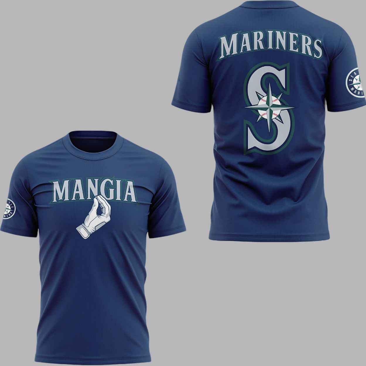 This navy blue shirt is a fun, two-sided tribute to the Seattle team, blending their identity with a universally recognized cultural gesture. The front of the shirt features the bold text “MANGIA,” an Italian term meaning “eat!” or “eat up!”—a spirited call to victory and feasting on the competition. This word is paired with a distinct graphic of a hand making the gesture often associated with that phrase, adding a layer of humorous, visual communication. The back of the shirt proudly displays the team’s core identity: the word “MARINERS” is arched above a large, striking rendition of the iconic compass rose ‘S’ logo, rendered in bold grey and white, ensuring the team’s allegiance is unmistakable. This apparel is far more than simple fan gear; it is a blend of passionate fandom and playful, cultural expression. It embodies a fun-loving spirit and a confident attitude towards the game, suggesting that the team is ready to dominate. Wearing this shirt is a unique way to celebrate the excitement of the season and declare that the Mariners are ready to feast on their opponents.