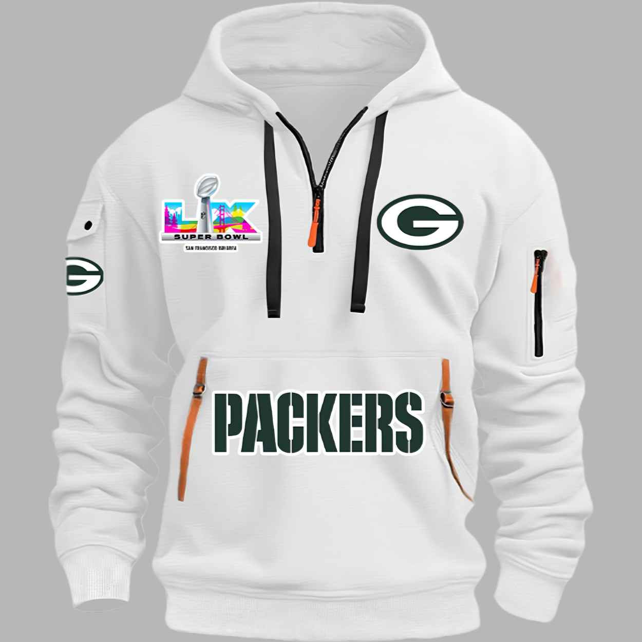 This white hoodie features a clean, professional aesthetic with modern functional details like zippered pockets and a structured quarter-zip neckline. The design is a bold celebration of the team’s pursuit of greatness, prominently displaying the iconic “G” emblem alongside the vibrant Super Bowl LX logo to mark the 2025 championship destination. Beyond its sharp visual appeal, this garment represents the unity and relentless spirit of a community that has carried a century-old winning tradition into the modern era. It is a creative masterpiece designed for those who want to represent their lifelong passion with a high-performance silhouette that transitions perfectly from a chilly game day to everyday city wear.
