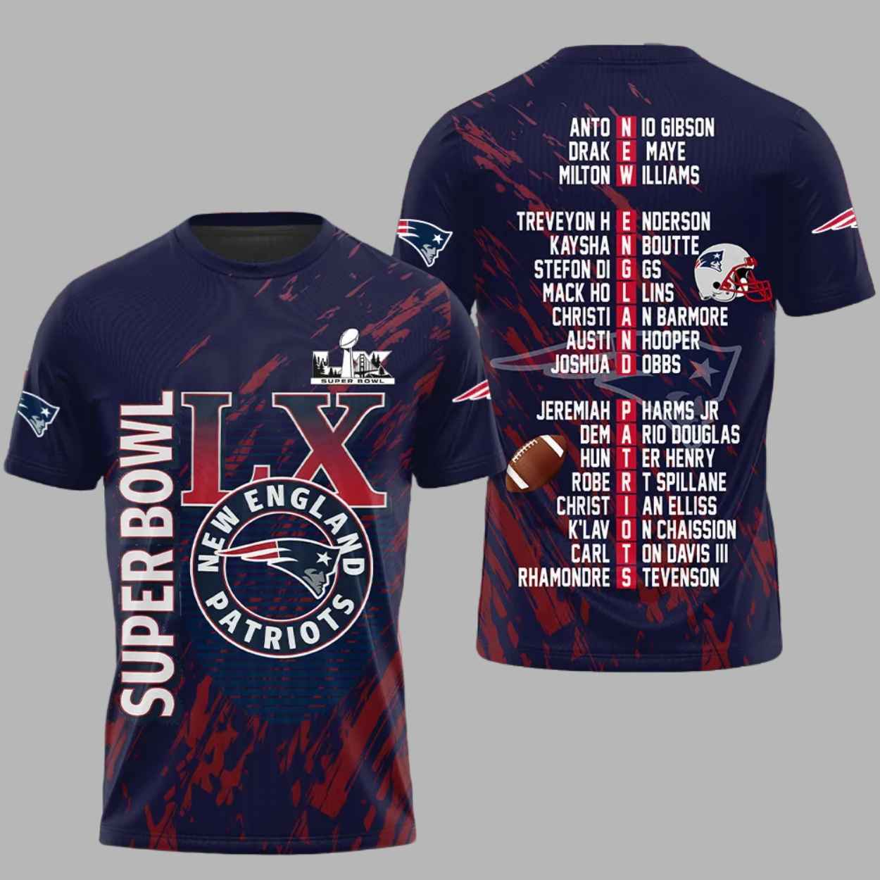This shirt features an elite all-over print design that captures the prestige of the milestone Super Bowl LX. The front is anchored by a bold “LX” graphic and the iconic team crest, while the back showcases a dynamic roster list of the playmakers who fought to reach the grandest stage in football. It serves as a wearable archive of excellence, symbolizing the grit, determination, and unity of a squad that proved they belong at the very top of the game.