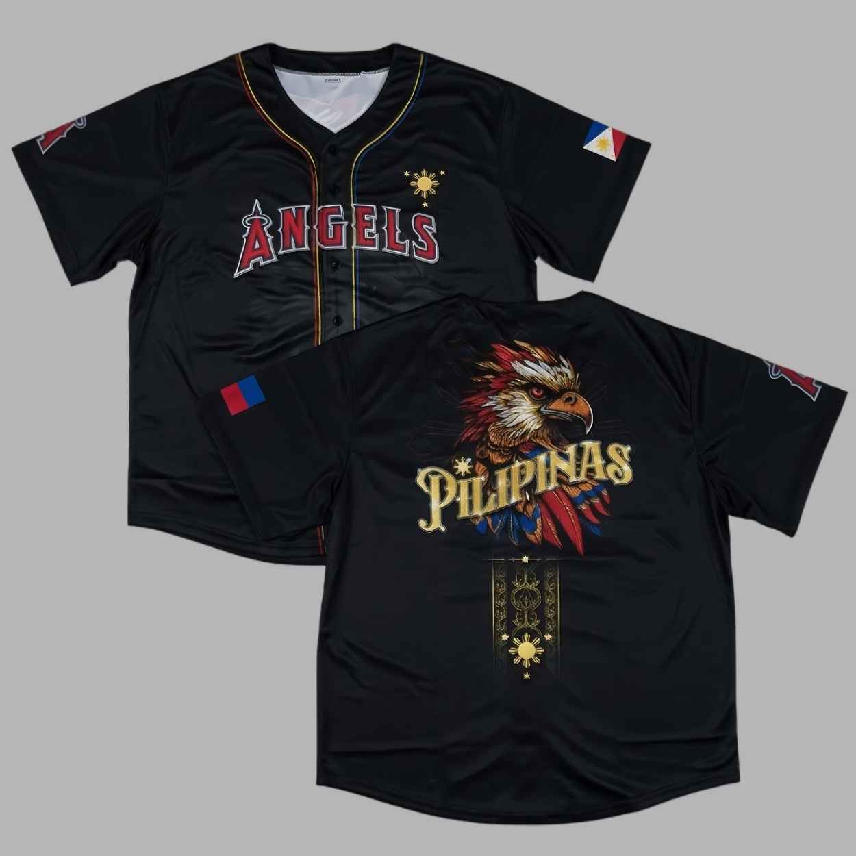 The 2026 Angels Filipino Heritage Night Jersey Giveaway is a powerful symbol of heritage, unity, and the diverse energy of the fan base. Featuring a sleek black base with a classic button-down silhouette, the design is anchored by the iconic “ANGELS” script across the chest, uniquely integrated with the sun and stars of the Philippine flag. The back of the jersey showcases a striking, high-definition Filipino Eagle graphic above the “PILIPINAS” text, commemorating the 2026 season as a historic bridge between legendary team pride and the enduring strength of the Filipino spirit.