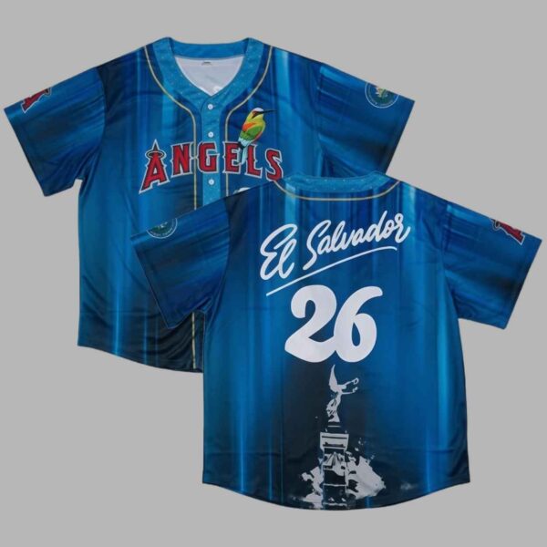 The 2026 Angels Salvadoran Heritage Day Jersey Giveaway is a striking symbol of heritage, unity, and the diverse energy of the fan base. Featuring a deep cerulean blue base with vertical gradient accents, the design is anchored by the iconic “ANGELS” script across the chest, uniquely integrated with a vibrant Torogoz—the national bird of El Salvador—resting on the lettering. The back of the jersey showcases a beautiful white “El Salvador” script above the number 26, commemorating the 2026 season as a historic bridge between legendary team pride and the enduring strength of the Salvadoran spirit.