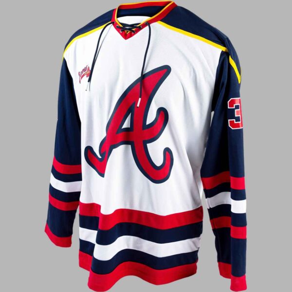 The 2026 Braves Drake Baldwin Hockey Jersey Giveaway features a crisp white body accented by powerful navy and red stripes, anchored by the iconic stylized “A” on the chest. This design represents the grit and toughness of the rink combined with the precision and tradition of the diamond, celebrating the multi-sport talent of rising star Drake Baldwin. It serves as a symbol of crossover excellence, showing that the spirit of the game remains the same whether you’re standing behind home plate or guarding the crease.