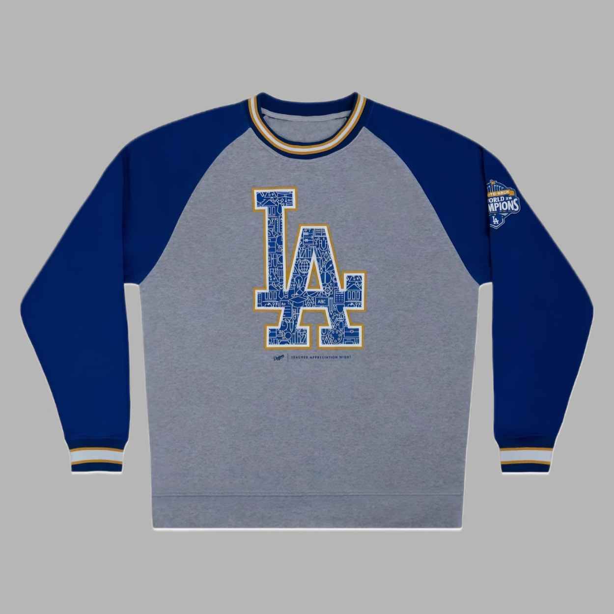 The 2026 Dodgers Teacher Appreciation Night Sweatshirt Giveaway features a classic grey heather body paired with deep royal blue sleeves, capturing the timeless aesthetic of the team. The centerpiece is a large, iconic “LA” monogram filled with a creative mosaic of educational icons—including books, lightbulbs, pencils, and graduation caps—symbolizing the diverse ways teachers illuminate the future. This design serves as a wearable tribute to the intersection of learning and community, representing the profound impact that educators have on every generation of fans.