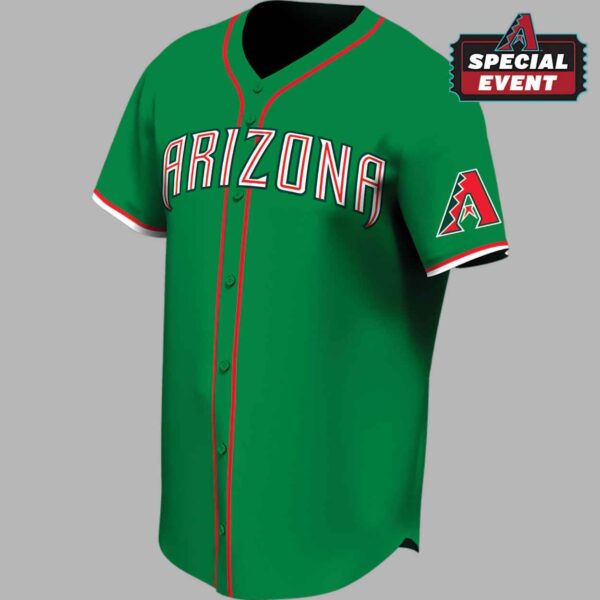 The 2026 Giveaway Dbacks Mexican Heritage Jersey is a bold symbol of international unity and the deep-rooted connection between Arizona and Mexican culture. Dressed in a striking emerald green, the design features “ARIZONA” in a classic arched script with vibrant red and white outlines that mirror the colors of the national flag. This garment represents a celebration of diversity and shared athletic passion, commemorating the 2026 season as a historic year for our community and honoring the heritage of the fans who bring incredible energy to every game.