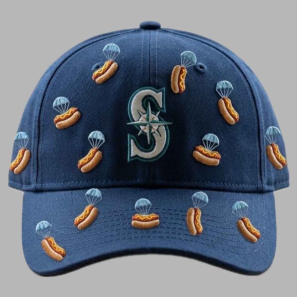 The 2026 Mariners Hot Dogs from Heaven Hat Giveaway features a creative, all-over embroidered design of hot dogs floating down on tiny parachutes. Set against a classic navy crown with the iconic “S” compass logo, this design symbolizes the fun, lighthearted energy that makes the stadium experience so unique. It represents the shared excitement of the crowd and the quirky moments that turn a simple game into a lifelong memory, making it a must-have accessory for fans who love the lighter side of baseball culture.