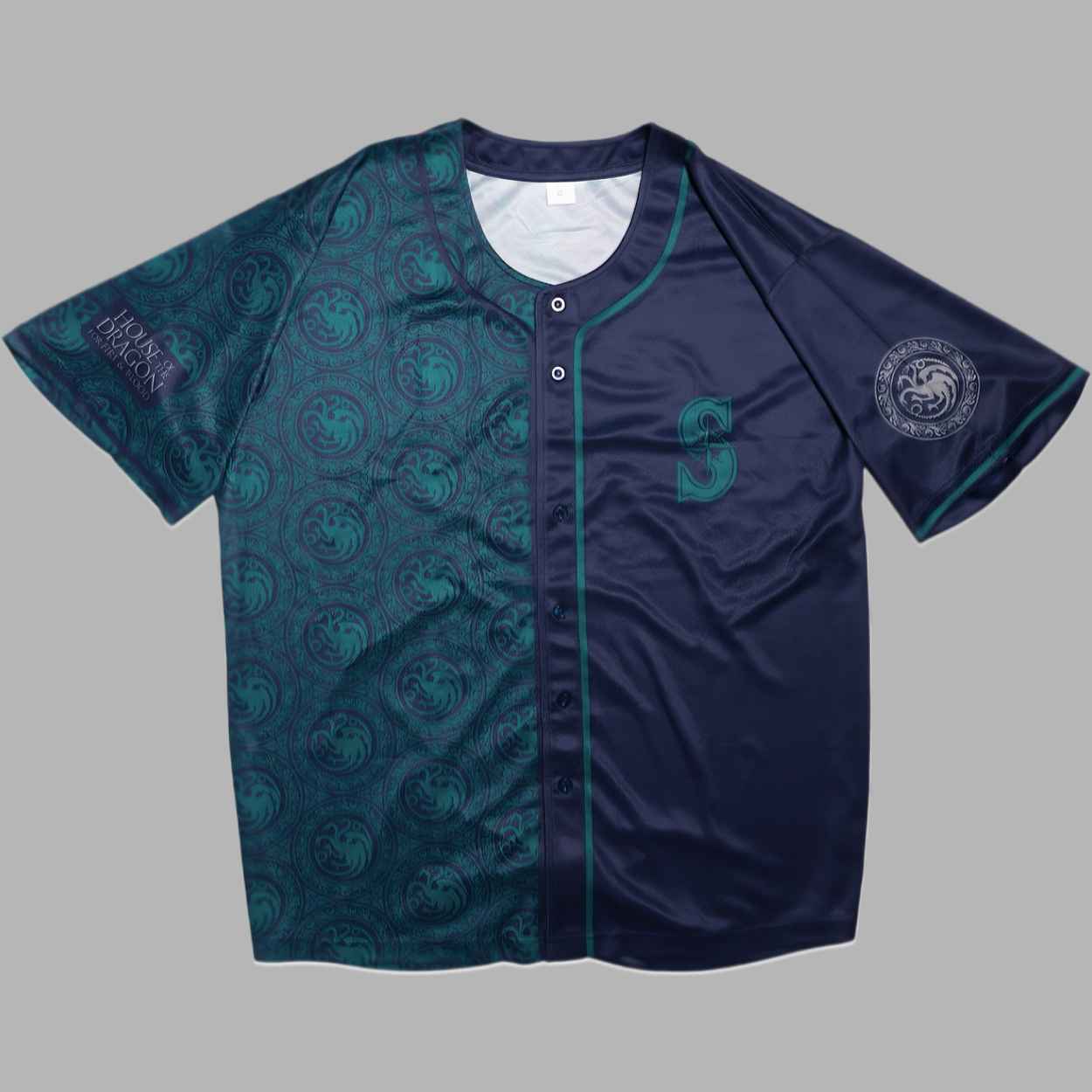 The 2026 Mariners House of the Dragon Jersey Giveaway is a masterful tribute to the iconic HBO series, blending the dark, mystical aesthetics of the Targaryen dynasty with modern baseball flair. Featuring a sophisticated split design, one side showcases a deep teal pattern of intricate dragon sigils, while the other maintains a sleek navy blue finish accented by the classic team “S” logo in a stylized teal font. This jersey symbolizes the strength, tradition, and competitive fire of two great houses, celebrating the high-stakes drama of the Seven Kingdoms and the enduring passion of the game in one commemorative garment.