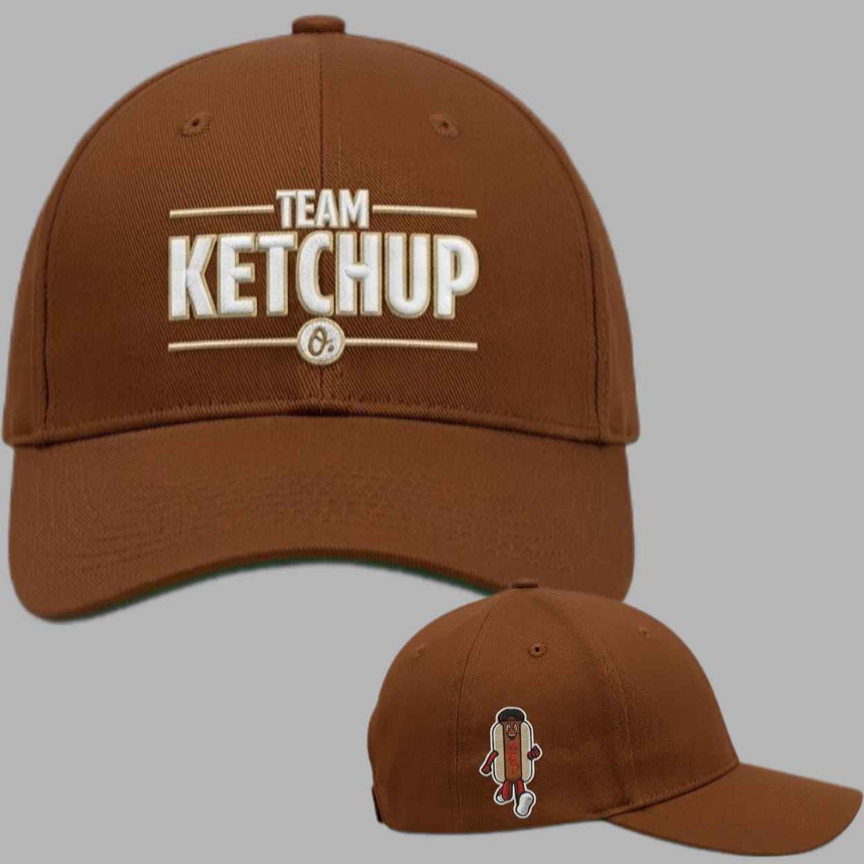 This cap features a rich tobacco-brown base that perfectly highlights the bold “TEAM KETCHUP” graphic on the front, representing one of the three legendary contenders in Birdland’s favorite tradition. The side panel is adorned with a charming illustration of the Ketchup character in full racing gear, while the classic Orioles “O’s” logo grounds the design in team heritage. This piece symbolizes the quirky, community-driven spirit of Baltimore baseball, honoring the fan-favorite Hot Dog Race that has become a cornerstone of the game-day experience for generations of the Birdland faithful.