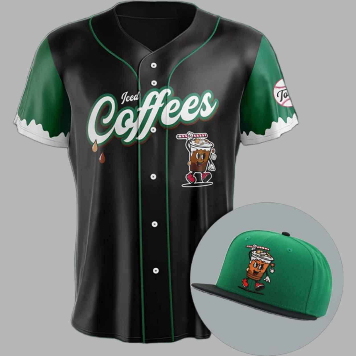 The 2026 Reading Iced Coffees Jersey Giveaway features a sleek black body accented by vibrant forest green sleeves with a “dripping” white trim, mimicking the condensation of a cold summer drink. The front is anchored by a playful, script-style “Iced Coffees” logo, complete with a charming cartoon iced coffee character wearing a cap and holding a bat. This design serves as a wearable tribute to the fun, community-focused promotions that make minor league traditions so special, symbolizing the perfect blend of a morning jolt and an evening at the diamond. Every detail, from the specialized coffee-bean brown accents to the thematic sleeve patches, is crafted to represent the buzzy energy and lighthearted joy that fans bring to every inning.