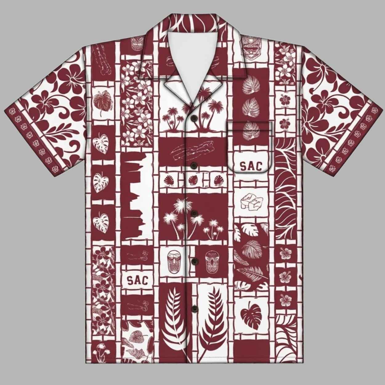 The 2026 River Cats Hawaiian Shirt Giveaway features a sophisticated, block-patterned design in a classic maroon and white colorway. The print is a unique fusion of tropical elements—like palm trees, hibiscus flowers, and tiki masks—interwoven with iconic local symbols and “SAC” lettering. This design symbolizes the vibrant community spirit of Sacramento and the laid-back joy of a summer evening at the park. It represents a wearable souvenir of the 2026 season, capturing the perfect balance between professional team pride and the carefree energy of an island getaway.