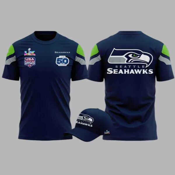 This apparel features a sophisticated navy and action green design that celebrates the 50th anniversary of the franchise alongside the excitement of the 2026 championship event in the San Francisco Bay Area. The front is anchored by a trio of commemorative insignias, including the prestigious Super Bowl LX logo and a special “50” shield, while the back showcases a bold, oversized hawk head above the classic team wordmark. It serves as a wearable timeline of excellence, representing five decades of grit and the unwavering pursuit of global glory on the world’s biggest stage.