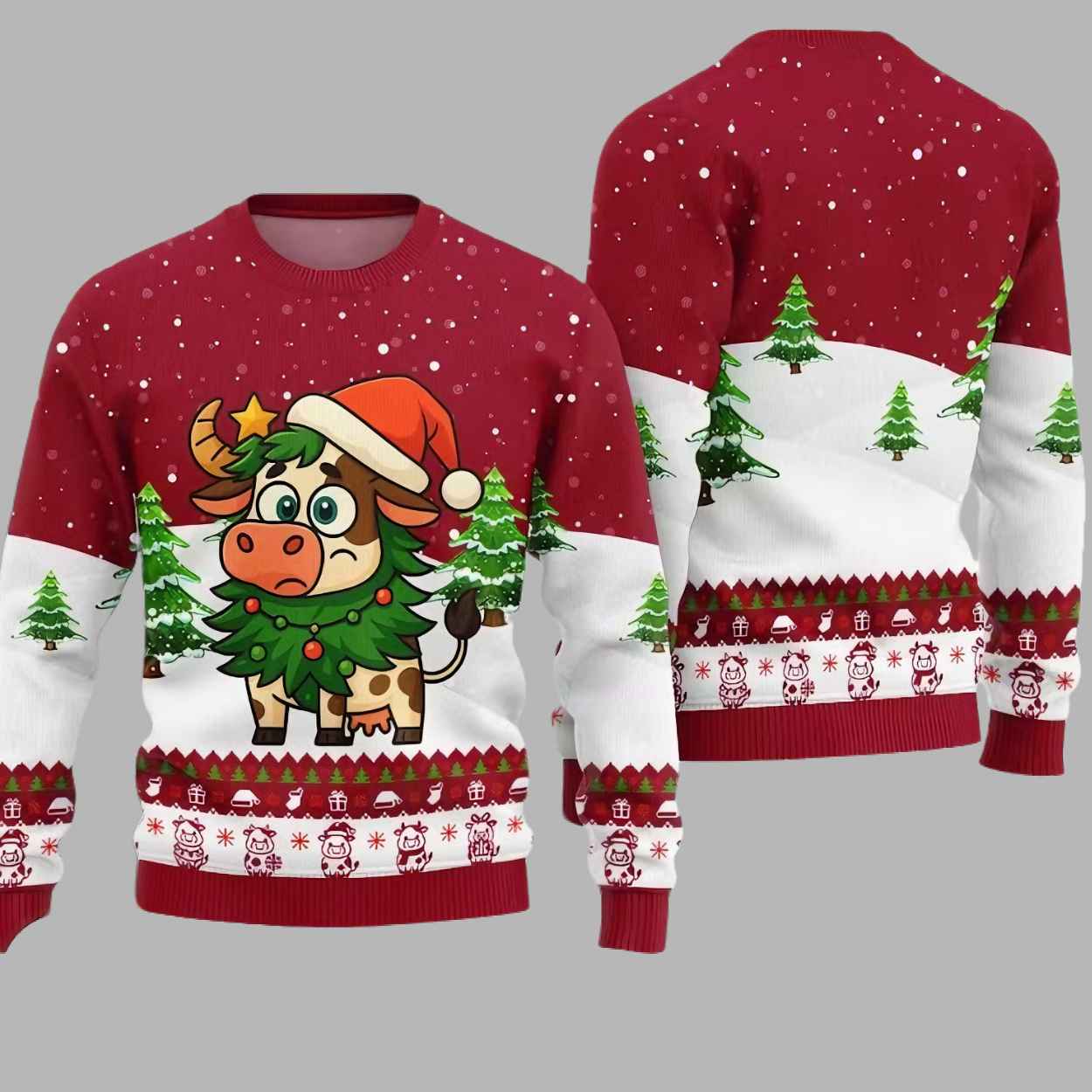 This vibrant red and white sweater captures a whimsical winter scene. The design features a festive landscape of snowy hills and evergreen trees. The central focus is an utterly charming cow wearing a Santa hat and hilariously wrapped in a string of garland and ornaments, transforming it into a living Christmas tree with a star atop its head. The bottom border of the sweater features a classic “ugly sweater” pattern, incorporating snowflakes, gifts, and tiny, stylized cows.