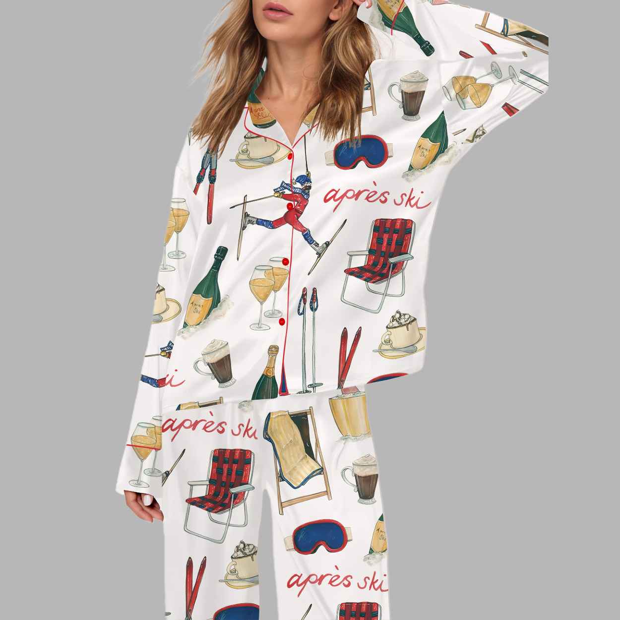 This elegant, long-sleeved pajama set features a silky white fabric adorned with a whimsical, watercolor-style pattern in vibrant red, green, and gold accents. The motif is a charming collage of classic ski lodge essentials: cheerful skiers mid-jump, champagne bottles and flutes, cozy hot chocolate mugs, plush deck chairs, ski poles and goggles, and the bold, handwritten script “Après Ski.” The set is trimmed with contrasting red piping, lending it a crisp, classic finish. This garment transcends standard sleepwear by celebrating the entire experience of a winter holiday—the exhilaration of the mountain followed by the luxury of the lodge. It embodies a sense of carefree indulgence and sophisticated relaxation, transforming your nightly rest into a five-star resort experience while offering the light, fluid comfort of a silky fabric.