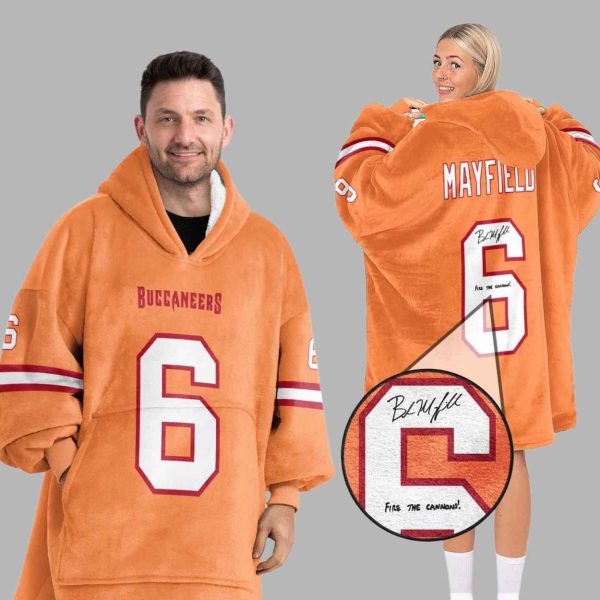 This incredibly oversized hoodie combines the comfort of a blanket with the style of a team jersey, making it the perfect item for lounging, tailgating, or watching the game from home. The rich orange fabric is instantly recognizable, proudly displaying the team spirit. The front features the bold white text “BUCCANEERS” above the large, prominent number “6” in white with a red outline. The back is dedicated to the player, with “MAYFIELD” arching over the same striking number “6”. A unique, personalized touch is the enlarged detail on the back, which showcases a facsimile of the player’s signature along with the rallying cry, “Fire the Cannons!”, adding an exciting, commemorative feel to the garment. The design includes wide, cozy sleeves and a massive front pocket perfect for keeping hands warm or storing snacks. The hood is lined with soft, warm material, ensuring you stay completely snug. This item is far more than just comfortable apparel; it’s a powerful, wearable symbol of loyalty and shared team excitement, transforming the act of lounging into an active display of fandom. It embodies the high-energy spirit of the game while providing a comfortable retreat from the elements, making it an essential piece of support gear for the 2025 season and beyond.