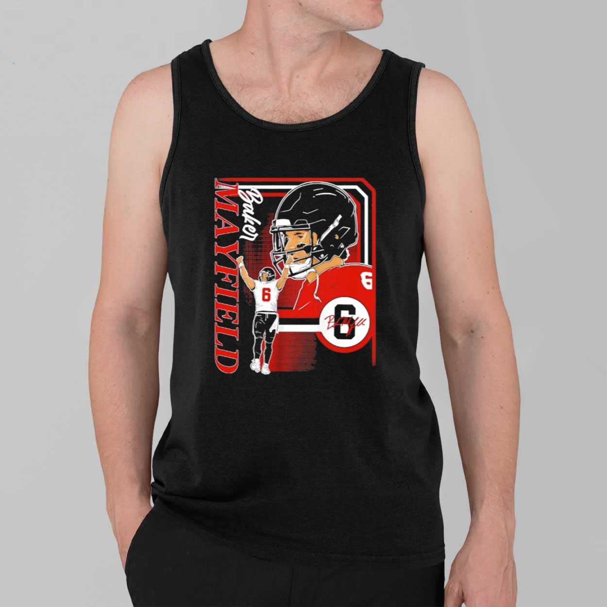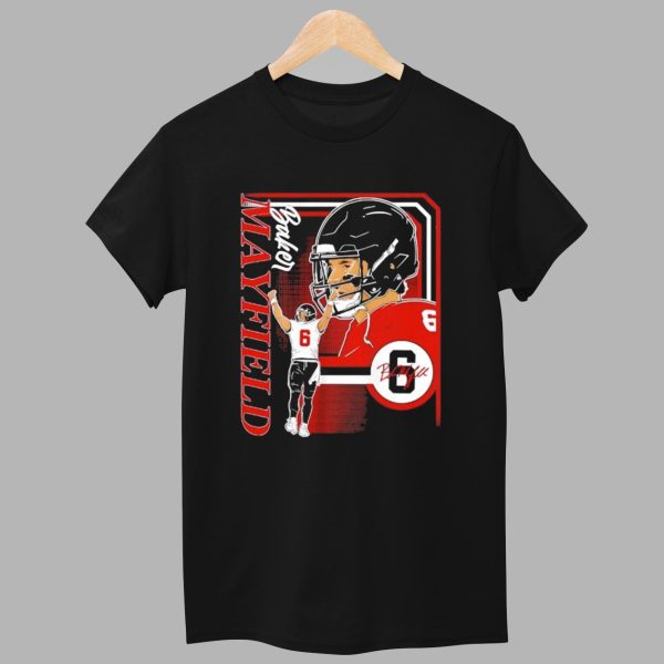 This high-impact and stylish t-shirt is a direct and powerful tribute to quarterback Baker Mayfield. The shirt features a dynamic, graphic illustration of the player in his action pose, celebrating a score or connecting with fans, alongside a close-up portrait in his helmet. The design uses the bold team colors of black and red, with the name “MAYFIELD” featured prominently along the side, and his number “6” emphasized in various styles. The overall aesthetic is raw, energetic, and features a distressed, comic book-style finish, perfectly capturing the player’s intense confidence and on-field charisma. This garment is far more than just a casual top; it’s a wearable symbol of resilience, competitive fire, and the never-say-die attitude that defines a great quarterback. It’s an ideal way to celebrate the thrilling energy of the game and show your appreciation for a leader who brings passion to every snap, perfect for game days, tailgates, or everyday wear to project a mindset of victory.