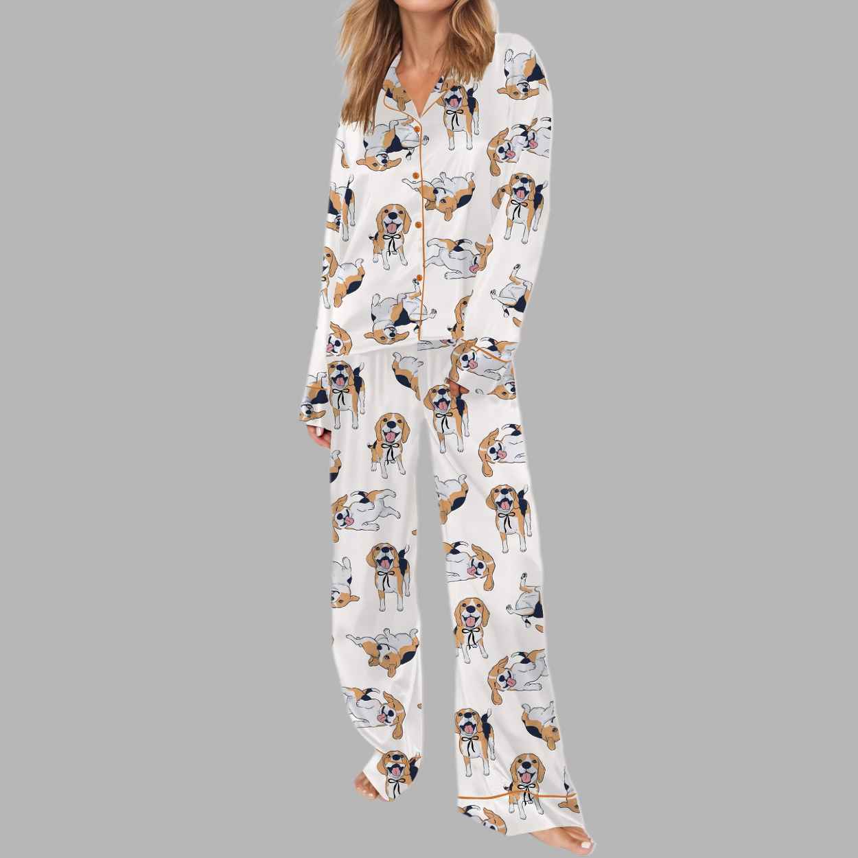This elegant, long-sleeved pajama set features a smooth, silky white fabric with a delightful, repeating pattern of adorable Beagle dogs in various playful poses—sitting sweetly, lying on their backs for belly rubs, and bounding about. The tricolor Beagles are rendered in realistic shades of brown, white, and black, some wearing small, charming bow ties. The set is trimmed with contrasting brown piping, adding a polished, classic finish. This garment transcends standard sleepwear by celebrating the Beagle’s famous cheerful, curious, and affectionate personality. It embodies the unconditional love and cozy companionship that dogs provide, transforming your nightly rest into a luxurious embrace while offering the light, fluid comfort of a silky fabric.