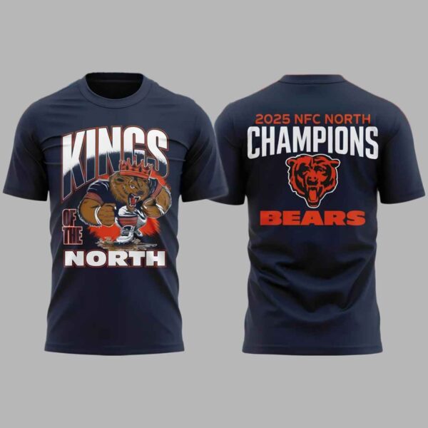 This navy blue t-shirt features a powerful double-sided design that captures the raw intensity of a championship-winning season. The front is dominated by a fierce graphic of a grizzly bear wearing a crown, emblazoned with the defiant “KINGS OF THE NORTH” title to signify total regional dominance. On the back, the message of victory is reinforced with the proud “2025 NFC NORTH CHAMPIONS” declaration and the iconic team logo. Beyond its striking aesthetic, this garment serves as a wearable trophy that honors the resilience of the players and the unwavering spirit of a community that stood together through every hard-fought yard on the road to the title. It is a creative masterpiece designed for those who want to carry the energy of the 2025 championship run wherever they go, making it a timeless piece of history for every dedicated supporter.