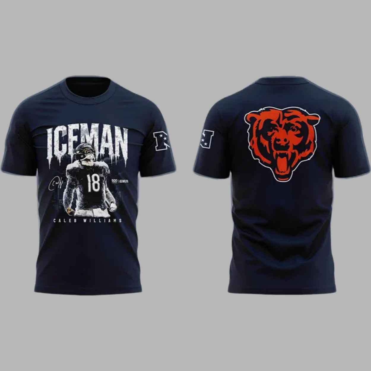 This striking navy blue t-shirt features a high-impact double-sided design dedicated to the team’s rising star. The front showcases a powerful “ICEMAN” graphic in a frozen, dripping font, centered above an action shot of Caleb Williams in his iconic number 18 jersey. This apparel is more than just a piece of clothing; it symbolizes the calm, collected confidence and “ice in the veins” mentality required to lead a historic franchise back to glory. The back of the shirt is anchored by a massive, vibrant orange and red bear head logo, representing the raw power and tradition of the Midway. Every detail, from the player’s signature print to the commemorative sleeve emblems, serves as a tribute to the passion of the fans and the bright future of the team.
