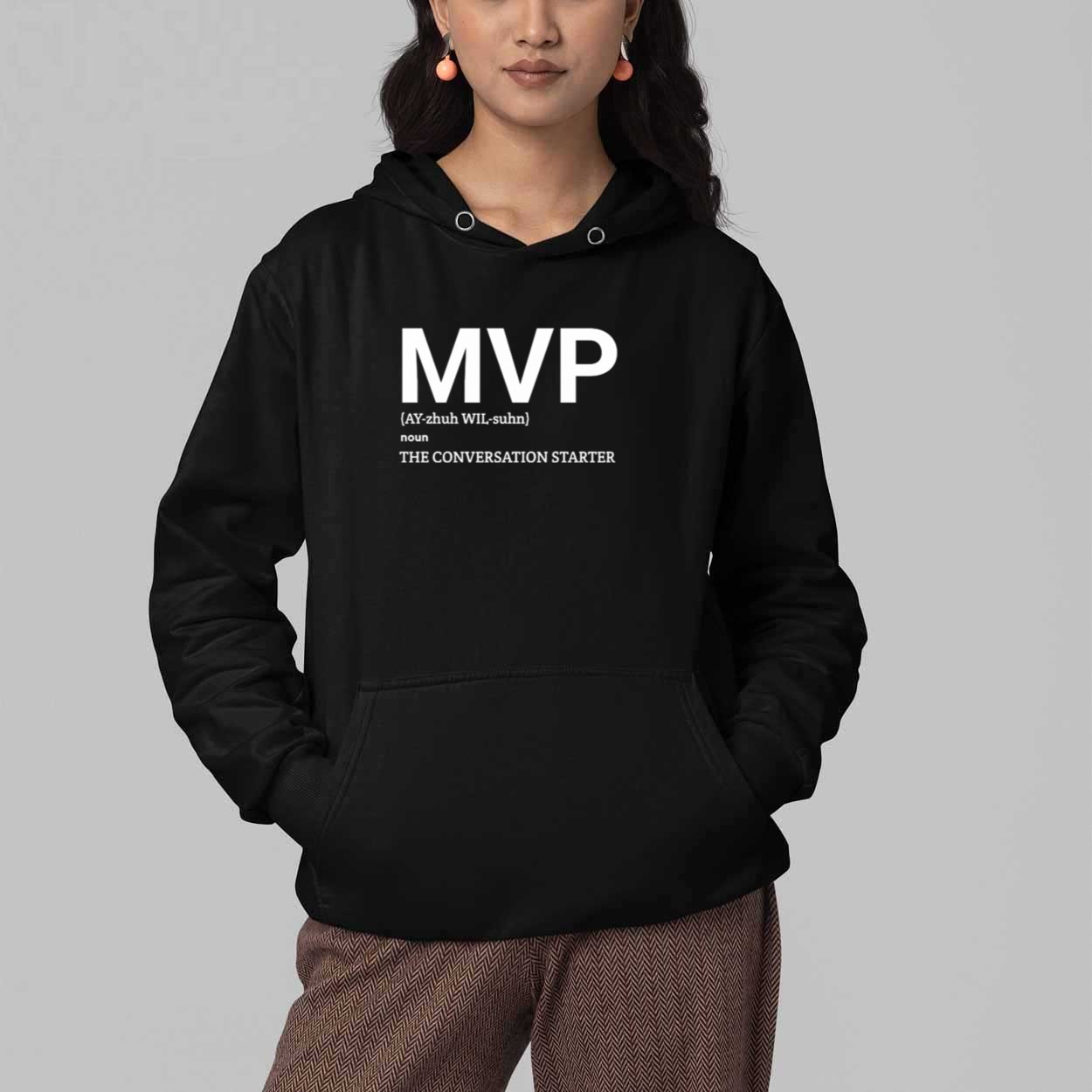 This classic black t-shirt features a bold, white text graphic that perfectly captures the unique humor of a common sentiment. The text reads: “MVP” in large, bold letters, followed by the phonetic spelling of A’ja Wilson’s name, “(AY-zhuh WIL-suhn)” and the definition, “noun THE CONVERSATION STARTER“. The minimalist design is clean and direct, letting the hilarious, long-form message speak for itself.