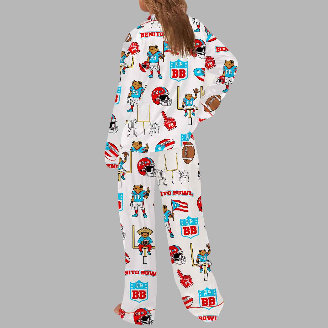 This pajama set features a long-sleeved, button-down top and matching full-length trousers, both designed with a smooth, luxurious satin finish. The base fabric is a crisp white, providing a bright canvas for the incredibly fun, all-over print dedicated to a specific Puerto Rican football theme. The print is a chaotic, celebratory collage of iconography, all rendered in the island’s red, white, and blue colors. Imagery includes football goalposts, helmets, foam fingers, footballs, the Puerto Rican flag, and adorable Coquí frogs dressed in football gear. The words “BENITO BOWL” and “BB” are scattered throughout the pattern, tying the theme together. The set is neatly finished with contrasting red piping along the edges of the top and trousers, enhancing the classic pajama silhouette. This sleepwear is far more than just a cozy outfit; it is a spirited, unique symbol of cultural pride and passionate sports fandom. It embodies the vibrant, energetic spirit of the island and the fun, imaginative world of its football culture, making it a delightful and memorable garment for those who love Puerto Rico and the game.