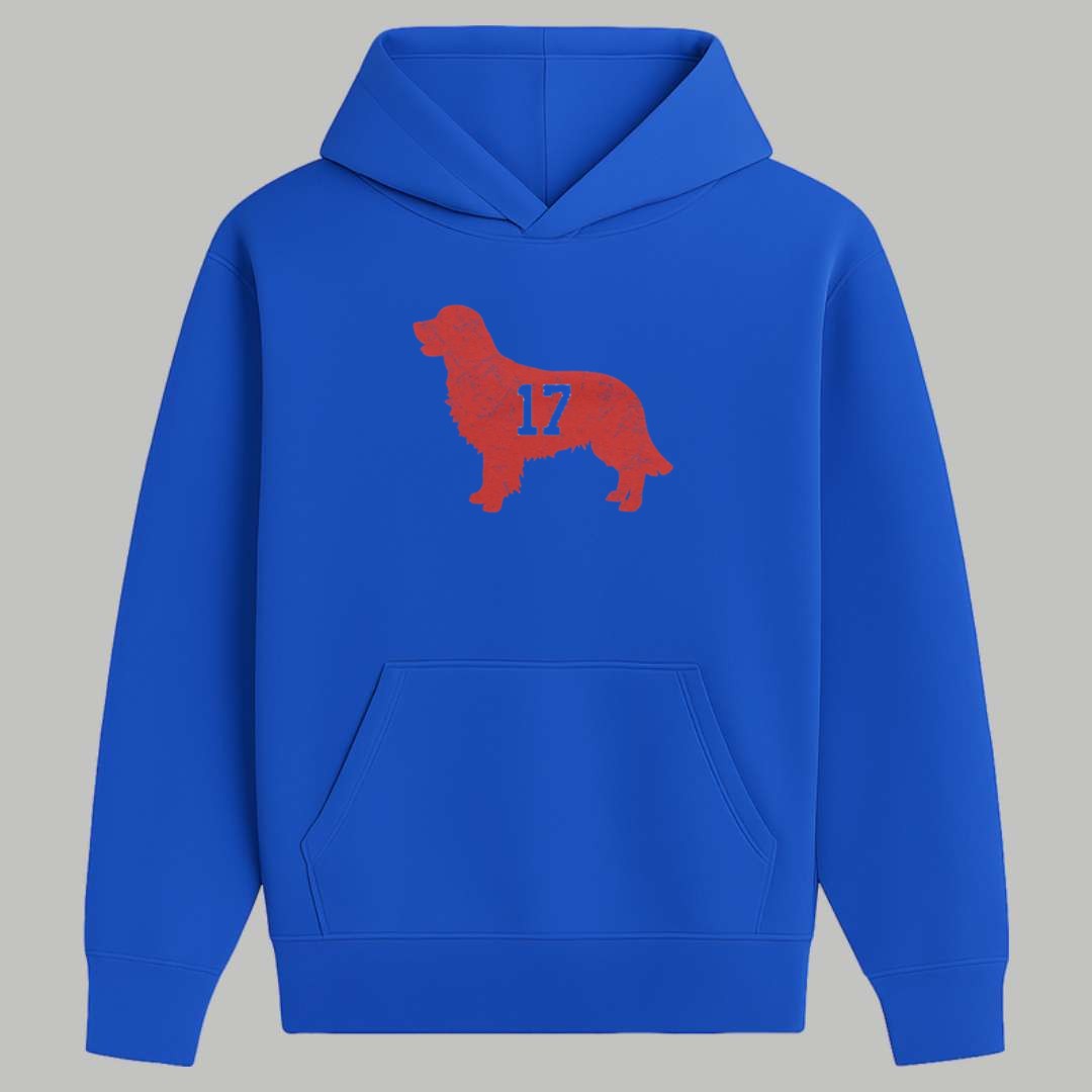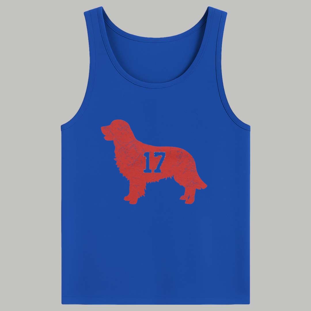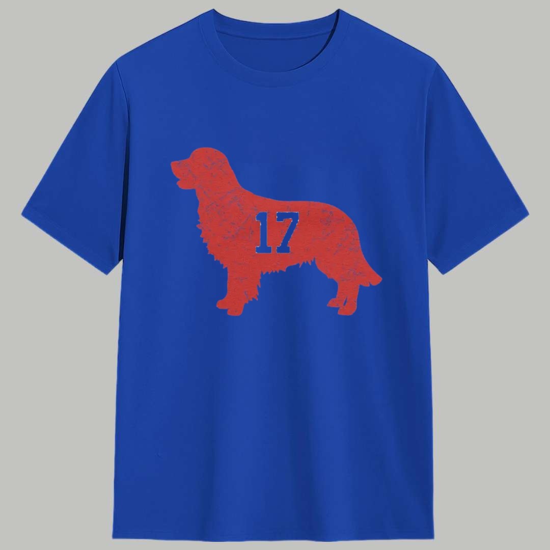This vibrant blue T-shirt features a bold graphic silhouette of a golden retriever dog in red, a universally beloved symbol of loyalty, enthusiasm, and energy. Overlaying the dog’s body is the quarterback’s jersey number, “17,” in blue text. This apparel cleverly blends the cherished image of the “Golden Boy” dog breed with the popular nickname and number of the star player. It’s a lighthearted, witty way for supporters to express their devotion, symbolizing the unwavering loyalty and positive energy that both the dog breed and the quarterback embody for the team. This tee is a perfect, distinctive piece for fans who appreciate a clever pun and a strong, graphical statement.