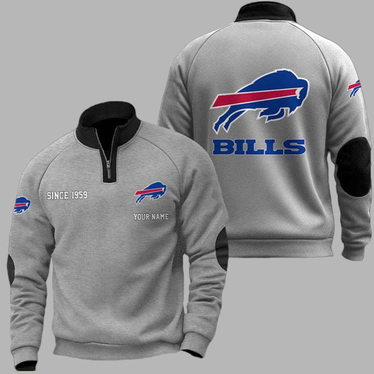 This premium navy blue sweatshirt features a sophisticated quarter-zip collar accented with a vibrant orange trim that commands attention. The chest is detailed with the historic “SINCE 1959” founding year and the iconic charging buffalo, while the back displays a massive team logo and bold “BILLS” typography. Beyond its striking appearance, this garment serves as a wearable timeline of the Buffalo community’s grit and deep-rooted traditions. Every detail, from the reinforced orange elbow patches to the personalized “Your Name” feature, represents a unique connection to a heritage of passion that has unified supporters through every frozen winter and thrilling victory.