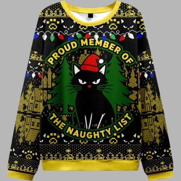 This spectacularly bold sweater features a striking, high-contrast palette of deep black and vibrant gold-yellow, immediately setting a playful, mischievous holiday tone. The centerpiece graphic is a powerful image of a black cat, seated between two green Christmas trees, wearing a defiant Santa hat and giving a fierce, unblinking gaze. Above and below the cat, the bold, curved text declares the wearer’s status: “PROUD MEMBER OF THE NAUGHTY LIST”. The entire design cleverly blends this witty, defiant humor with a chaotic, festive aesthetic. The background and borders feature intricate rows of golden-yellow houses and small, pixelated, wide-eyed figures, along with scattered Christmas lights, creating a bustling, slightly ominous texture. The contrast between the cozy, traditional knit aesthetic and the fierce, unapologetic message is the heart of the sweater’s comedic genius. This sweater is far more than a simple novelty item; it’s a confident, hilarious piece of visual comedy that celebrates the rebellious spirit, the unapologetic nature of cats, and the fun of breaking free from the expectations of holiday perfection. It speaks to the wearer who possesses a sharp, self-aware sense of humor and uses irony to navigate the social pressures of the season, transforming a holiday trope into a comfortable, witty, and immediate symbol of self-acceptance and festive chaos.