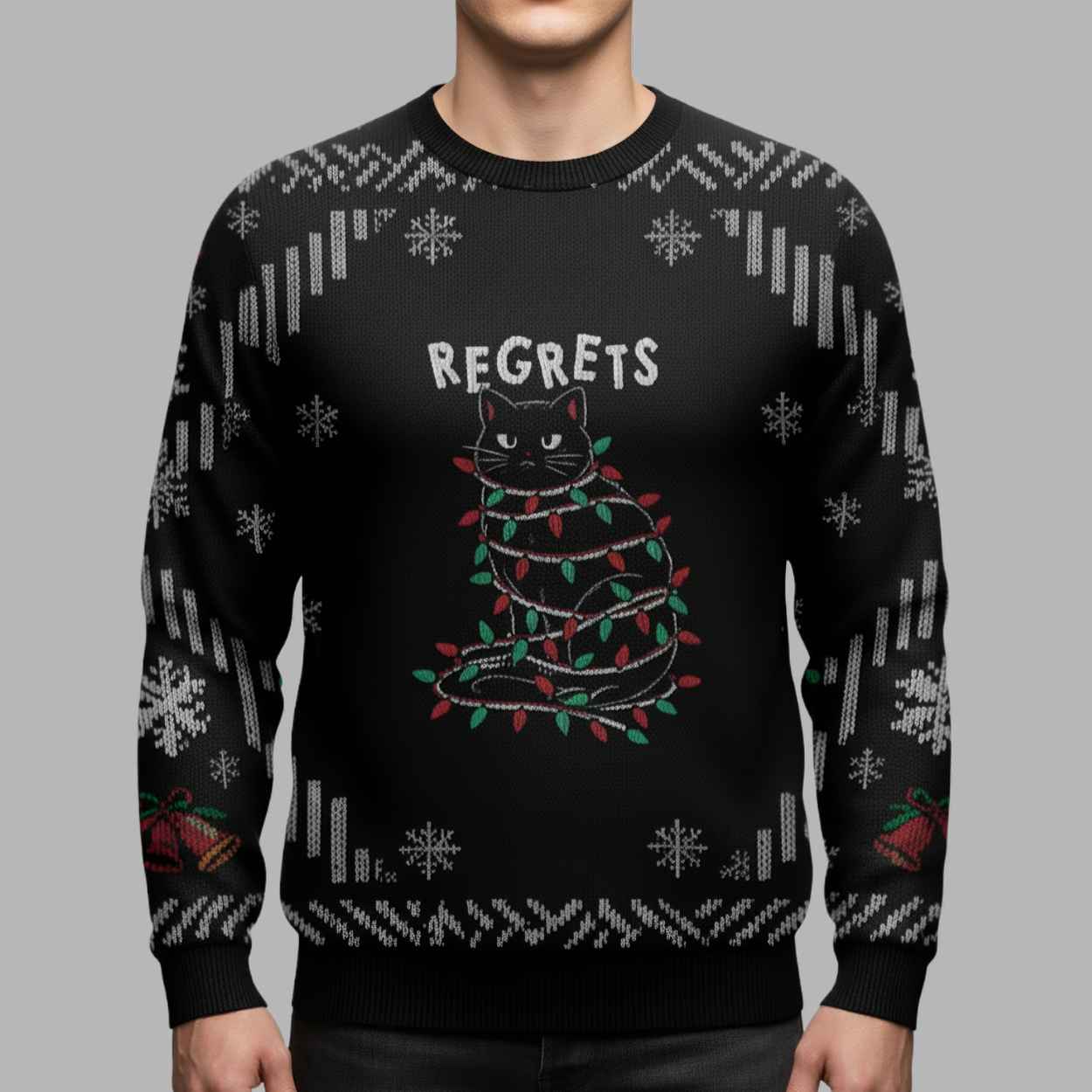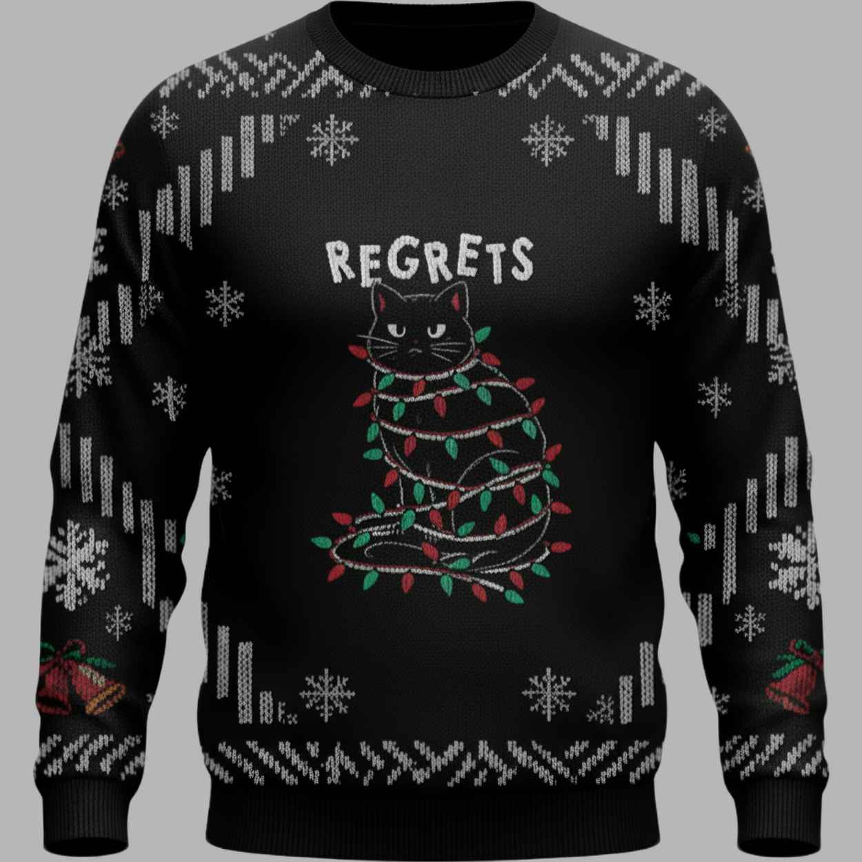 This spectacular sweater features a dominant, cozy black background, contrasted sharply by crisp white and red knit patterns, giving it a classic, high-contrast festive look. The centerpiece graphic is a brilliant, instantly relatable image of a sleek black cat, seated rigidly with a look of intense, grumpy displeasure. The cat is completely entangled in strings of red and green Christmas lights—a scene known by every cat owner who has dared to put up a tree. Above the disgruntled feline, the bold white text delivers the simple, humorous conclusion: “REGRETS”. The entire design cleverly blends this self-aware, chaotic humor with traditional “ugly Christmas sweater” motifs. The background and borders feature intricate rows of large, white snowflakes, geometric zigzags, and small bells, all reinforcing the cozy, winter aesthetic that contrasts sharply with the cat’s miserable predicament. This sweater is far more than a simple novelty item; it’s a brilliant piece of visual comedy that validates the universal truth of holiday chaos and the inevitable destruction caused by curious pets. It transforms the feeling of festive annoyance into a shared, celebrated joke, suggesting that embracing the chaos (and the resulting regrets) is the key to true holiday fun. It appeals to the wearer who possesses a sharp, self-aware sense of humor and uses irony to cope, making it a comfortable, witty, and immediate symbol of relatable resilience.