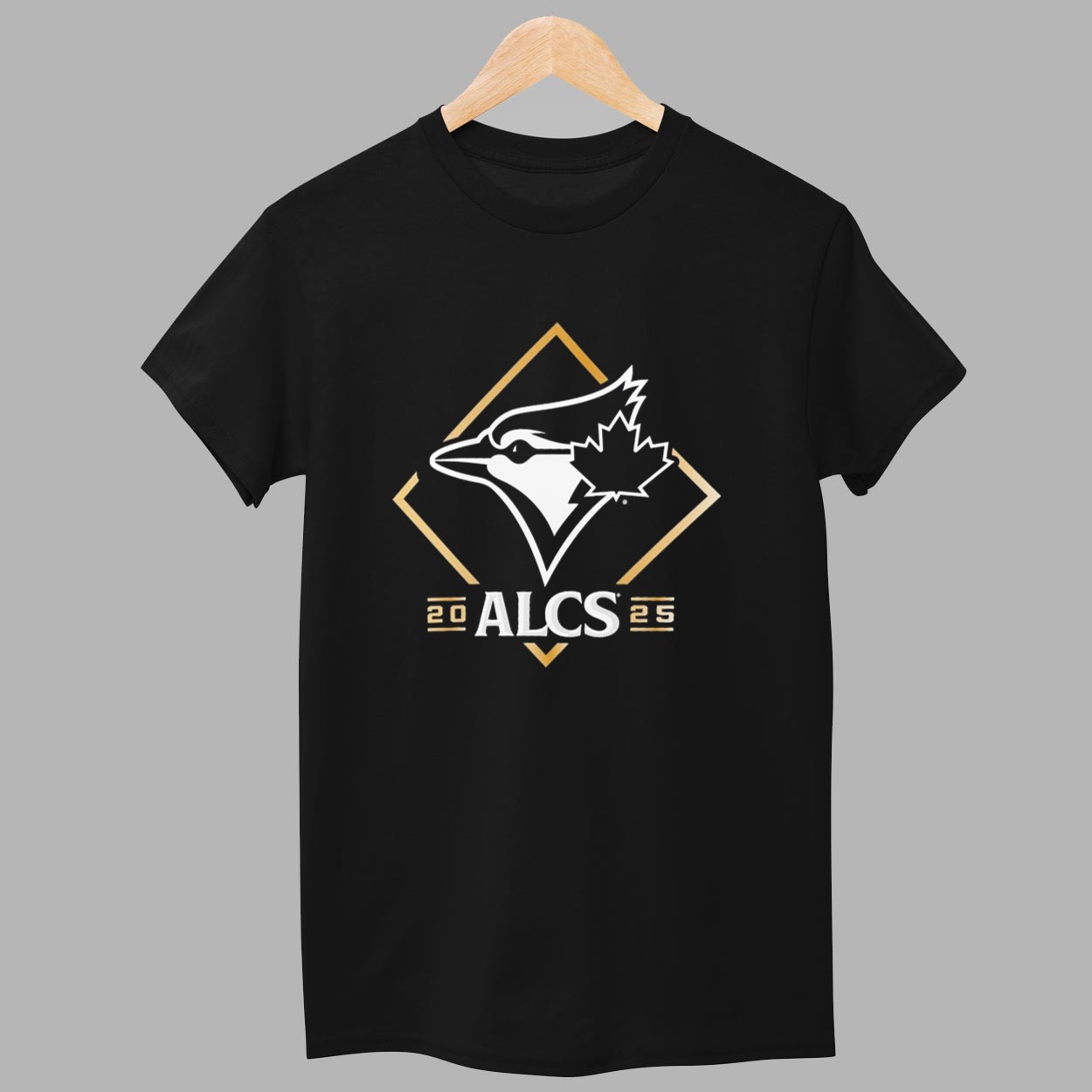 This sharp black t-shirt is a clean, modern tribute to the team’s postseason achievement. The design features a stylized, striking graphic of the team’s iconic bird head and maple leaf logo, centered within a gold diamond motif. Below this symbol of excellence, the bold text “20 ALCS 25” proudly proclaims the year and the stage of the playoff run. The meaning of this design is rooted in celebration, anticipation, and elite status. It transforms the shirt into a wearable commitment to the team’s relentless pursuit of the ultimate prize, symbolizing the high-stakes environment and the achievement of reaching the league’s final four. The clean, high-contrast black-and-white graphic, accented by the gold diamond, signifies both power and prestige. Wearing this shirt signals your deep emotional investment in the team’s success and your belief that they are ready to seize the championship. The shirt is designed with a comfortable, classic fit perfect for the intense energy of playoff watch parties.