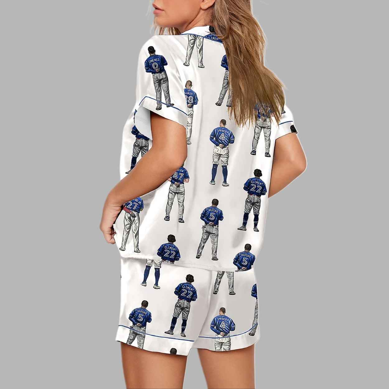The “Blue Jays Baseball 2025 Pajama Set” is a comfortable, stylish two-piece sleepwear ensemble that transforms into a visual roll call of the team’s talent. The crisp white fabric is covered in a captivating, repeating pattern featuring stylized, full-body illustrations of various players, primarily viewed from the back, showcasing their jersey names and numbers. The artistic rendering gives the players a unique, hand-drawn aesthetic, with some figures in home whites and others in road grays. This detailed, player-centric pattern is a sophisticated, fan-focused nod to the team’s identity for the 2025 season. It elevates casual sleepwear into a statement of intimate fandom, allowing the wearer to feel personally connected to the athletes who will define the year. It embodies the hope and anticipation surrounding a new season, wrapping the wearer in the confident energy of a powerful roster. The short-sleeve button-down top and matching shorts are neatly trimmed with contrasting blue piping, offering a cool, light, and comfortable fit that makes this set the ideal gear for both restful sleep and excited, game-day lounging.