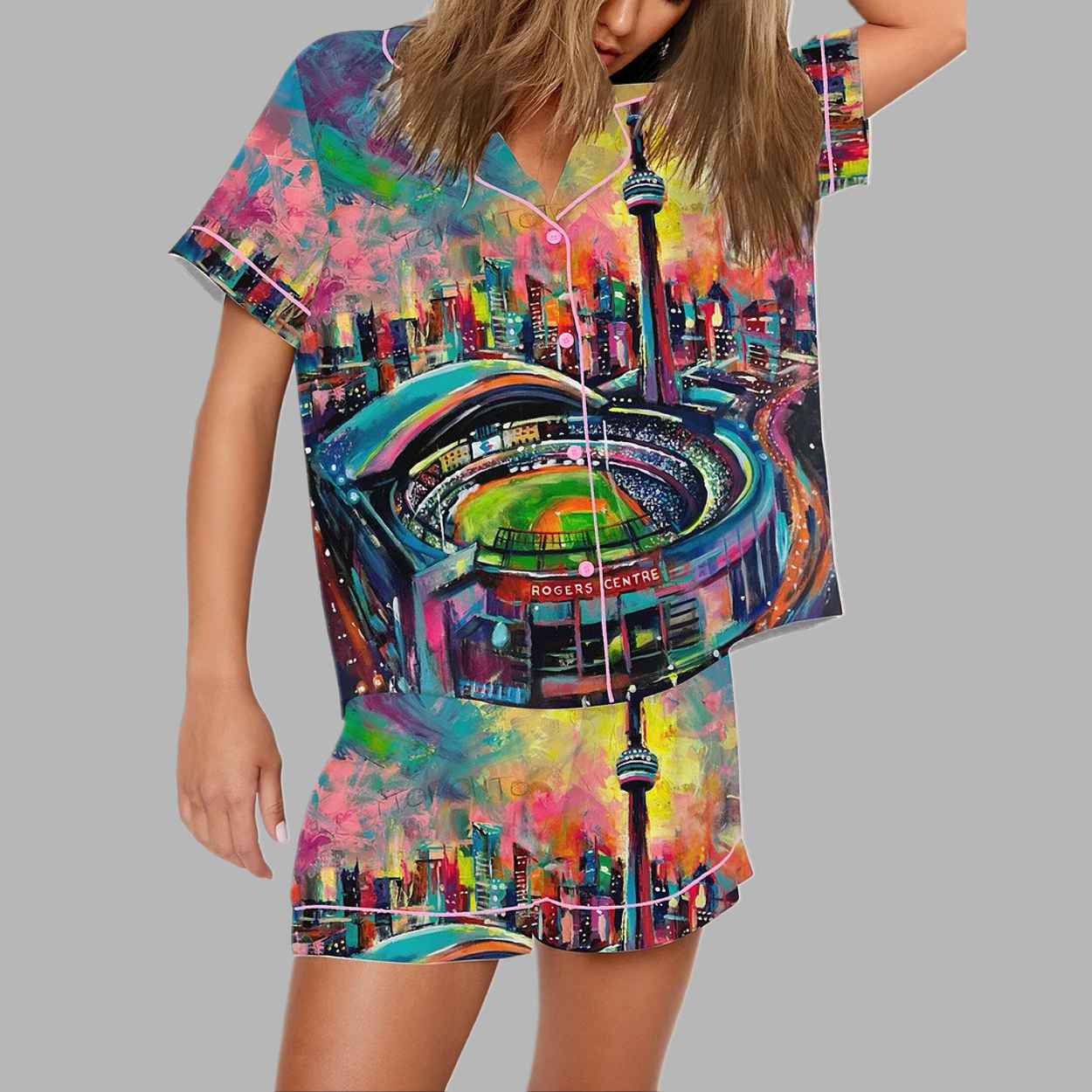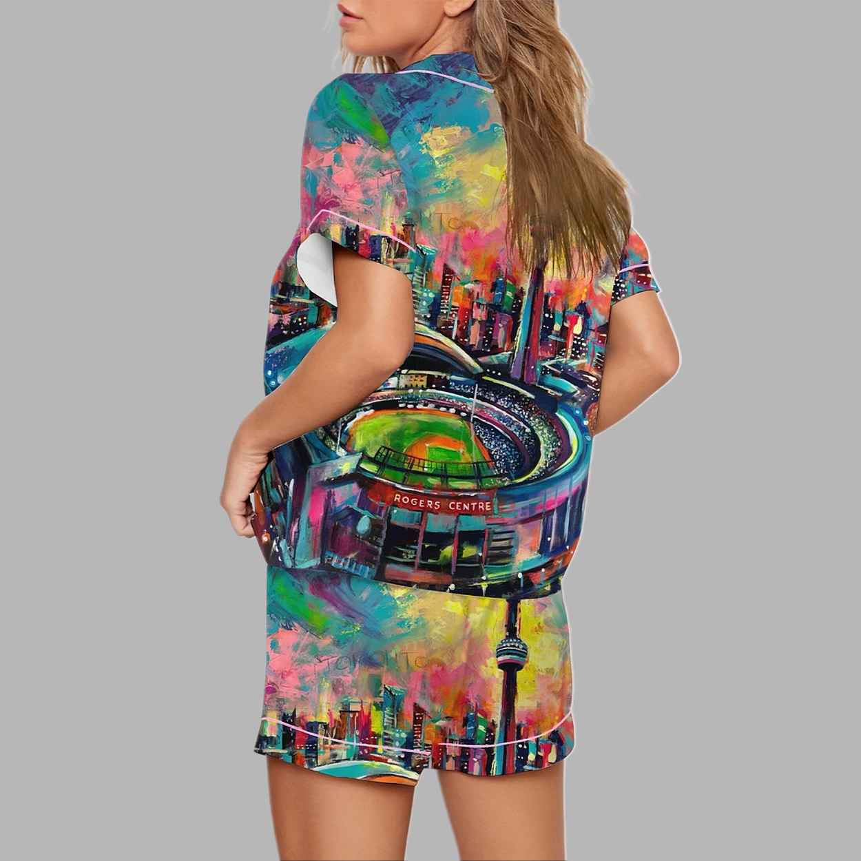 The “Blue Jays Baseball Go Jays Go Pajama Set” is a two-piece sleepwear set that transforms a classic artistic style into a stunning garment of team pride. The fabric is covered in a vibrant, full-coverage print featuring an aerial view of the iconic stadium nestled within the brilliant, colorful Toronto skyline, complete with the prominent tower. The image is rendered in a vivid, expressive, and almost impressionistic painting style, using a rich, saturated palette of neon pinks, blues, yellows, and greens that capture the electric atmosphere of a night game. This unique design is a profound tribute to the team’s connection to its city, symbolizing the heartbeat of Toronto and the shared passion that unites fans at the stadium. This set is more than comfortable loungewear; it’s a passionate declaration of city pride, a tribute to the team’s home, and a piece of art that celebrates the thrilling intersection of sports and culture. The short-sleeve button-down top and matching shorts are trimmed with delicate piping, providing a cool, light, and comfortable fit that allows you to dream in beautiful, high-definition color.