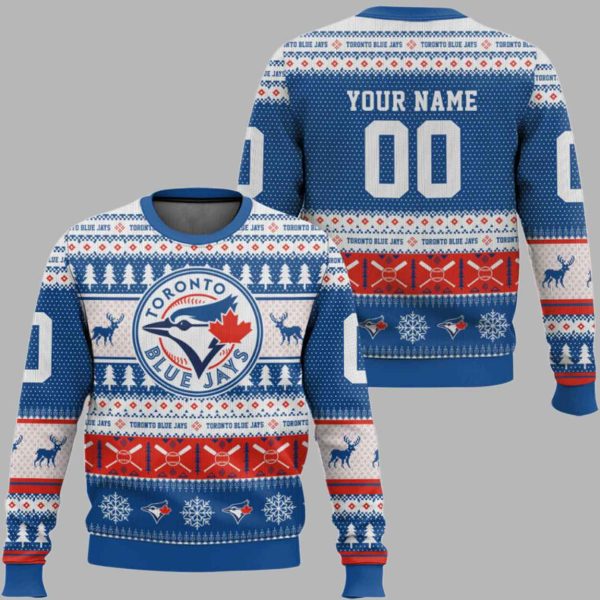 The “Blue Jays Custom Name And Number Ugly Sweater” is a vibrant, cozy pullover that flawlessly merges the classic “ugly sweater” aesthetic with passionate team pride and personalized style. The sweater features a bold color palette of blue, white, and red, framed by intricate, traditional Fair Isle knit patterns that have been creatively customized with team elements: mini pine trees, snowmen, and stylized reindeer. The front proudly displays the iconic circular team logo, complete with the prominent maple leaf, signifying the city and national connection. The overall knit pattern on the body incorporates recognizable baseball and team-related motifs. The reverse side, however, is the true standout: a large, clearly defined space for CUSTOM NAME and a massive CUSTOM NUMBER, transforming the sweater into a personalized jersey-style tribute. This design is a masterstroke of fan appreciation, symbolizing the wearer’s integral place in the team’s community and allowing them to literally put themselves into the game. It embodies the cozy, accepting spirit of the holiday season while proudly declaring one’s devotion. It’s a warm, comfortable, and immediately eye-catching piece that is perfect for game days, holiday parties, or simply showing personalized team spirit.