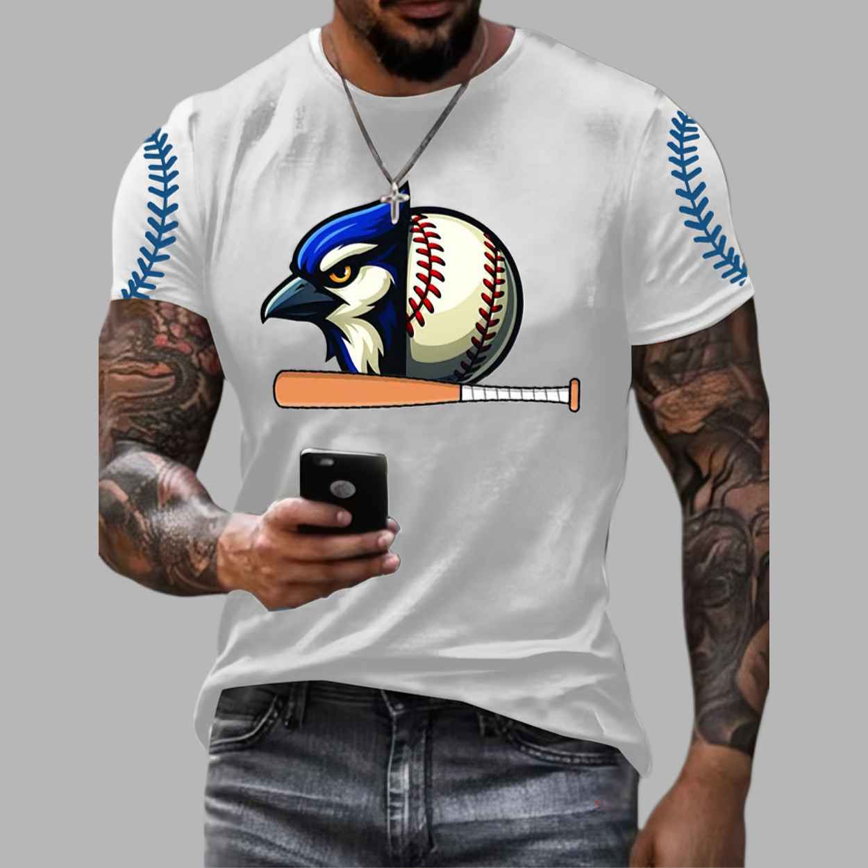 This dynamic and visually striking short-sleeved T-shirt is a direct and creative tribute to the spirit of the game. The shirt features a clean white base that allows the central graphic to command attention. The design is a powerful, stylized illustration that seamlessly fuses the fierce head of the Blue Jay mascot with a baseball, sitting above a wooden bat. This image symbolizes the intensity and focus of the team. The aesthetic is further enhanced by subtle, repeated baseball stitching graphics running down the shoulders or sleeves, adding an extra layer of sporty detail. This garment is far more than just a casual top; it’s a wearable symbol of competitive spirit, precision, and the fusion of mascot and sport. It’s an ideal way to celebrate the energy and excitement of the game and proudly represent your allegiance, perfect for game days, workouts, or everyday wear to project a mindset of determination.