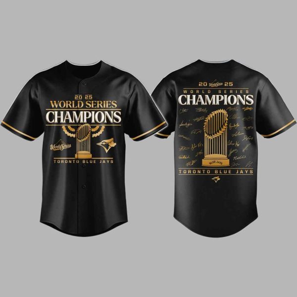 The “Blue Jays World Series 2025 Jersey” is a vibrant, custom baseball jersey set on a striking black background, dramatically accented with metallic gold trim on the sleeves, designed to evoke the elegance of a championship trophy. The front proudly displays a custom, commemorative design centered around a massive, golden championship trophy, flanked by the prominent dates “20 25.” Above and below the trophy, bold, gold text declares the ultimate aspiration: “WORLD SERIES CHAMPIONS,” making a clear, confident statement about the team’s destiny. The reverse side is a unique, fan-focused feature, showcasing a golden silhouette of the same championship trophy surrounded by an array of stylized signatures, recognizing the expected collective effort of the team. This design transforms a simple jersey into a sophisticated, wearable prophecy—a symbolic monument to a future title. It embodies the unwavering confidence, the excitement, and the collective pride of a fan base that demands the highest level of achievement. It’s a comfortable, breathable, and visually spectacular piece perfect for game days, celebrations, or simply showing absolute belief in the team’s potential for glory, connecting the fan’s passion directly to the dream of holding the trophy.