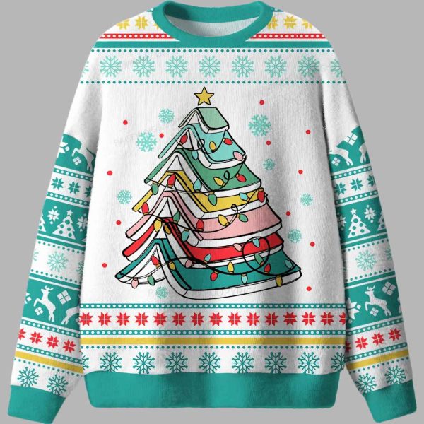 This sweater is a delightful and clever take on the classic “ugly Christmas sweater” style, brilliantly celebrating the joy of reading. The background is a crisp white, providing a snowy canvas for the vibrant, festive patterns that adorn the borders, sleeves, and hems. These patterns are richly detailed with classic motifs like white snowflakes, reindeer, stylized Christmas trees, and geometric shapes in a cheerful mix of red, white, and teal-green. The centerpiece is the incredibly creative Book Tree: an illustration of a Christmas tree cleverly constructed from stacked, colorful books. The “tree” is adorned with brightly colored Christmas lights and topped with a shining star, perfectly merging the holiday symbol with the love of literature. The design is framed by green ribbing on the collar and hem. This garment is far more than just cozy apparel; it is a visual tribute to the imagination, knowledge, and comfort that books bring into our lives. It symbolizes the magic of storytelling and the warmth of a winter spent curled up with a good read, making it a perfect declaration of a book lover’s passion.