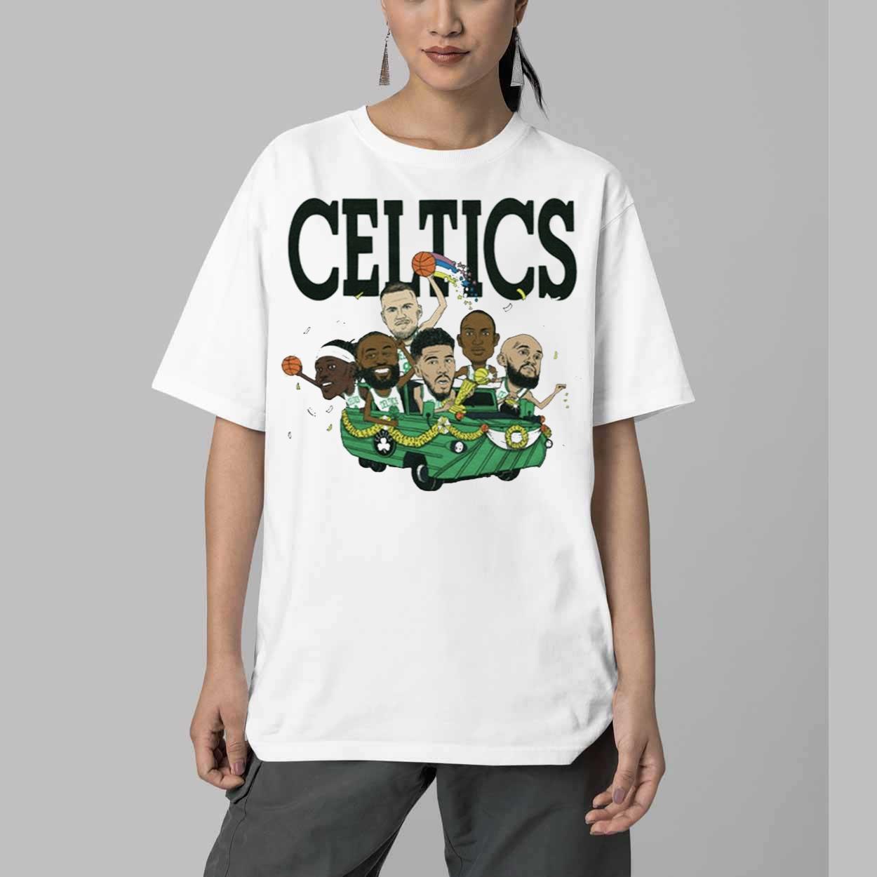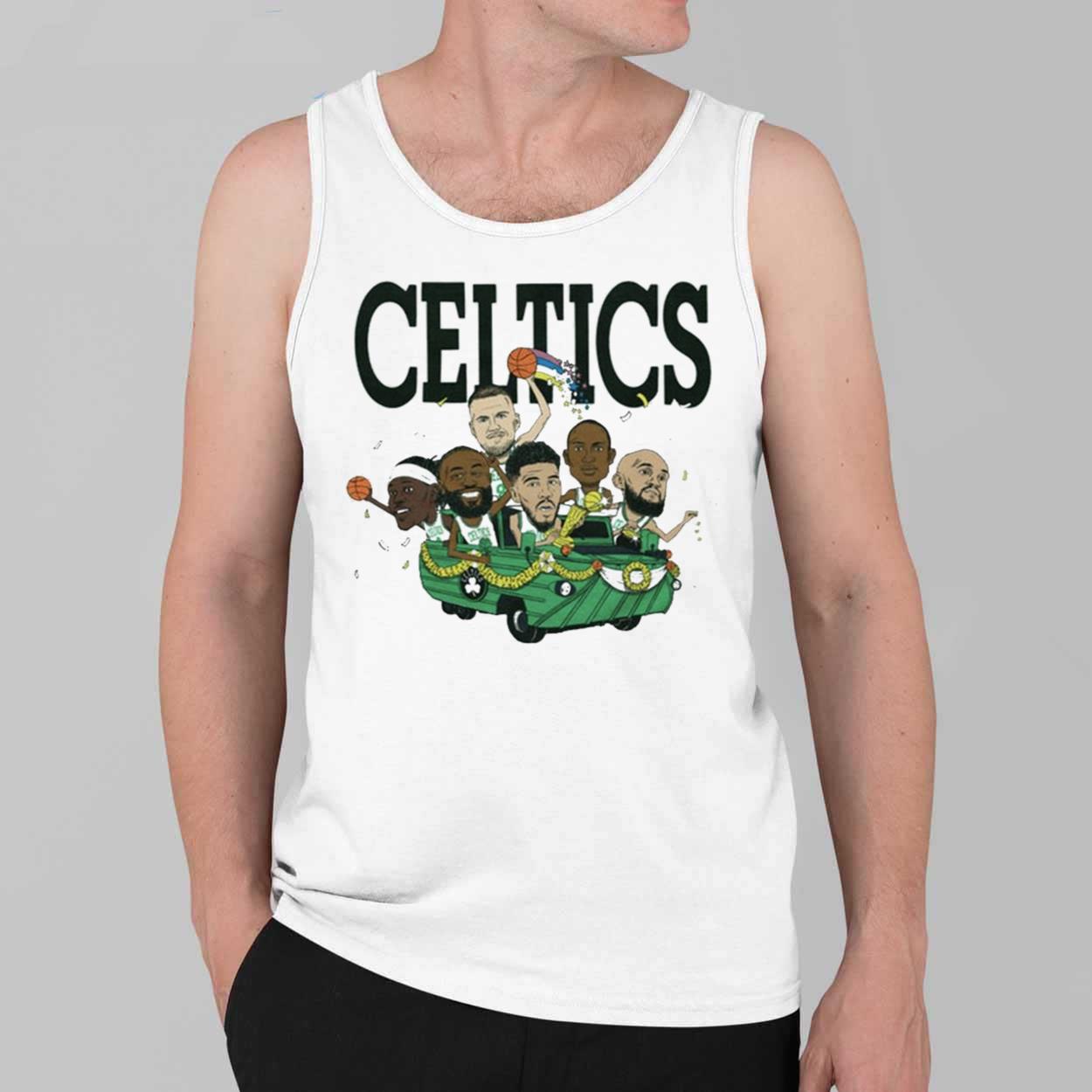 This quality t-shirt is made from soft and comfortable materials, ensuring a great fit and feel for everyday wear. The eye-catching design features a caricature of key Celtics players, including Jayson Tatum, Jaylen Brown, Marcus Smart, Al Horford, and Malcolm Brogdon, riding a championship duck boat, capturing the excitement and joy of their triumphant victory parade. The vibrant colors and detailed artwork make this shirt a true standout, perfect for game days, casual outings, or simply showing your Celtics pride wherever you go.