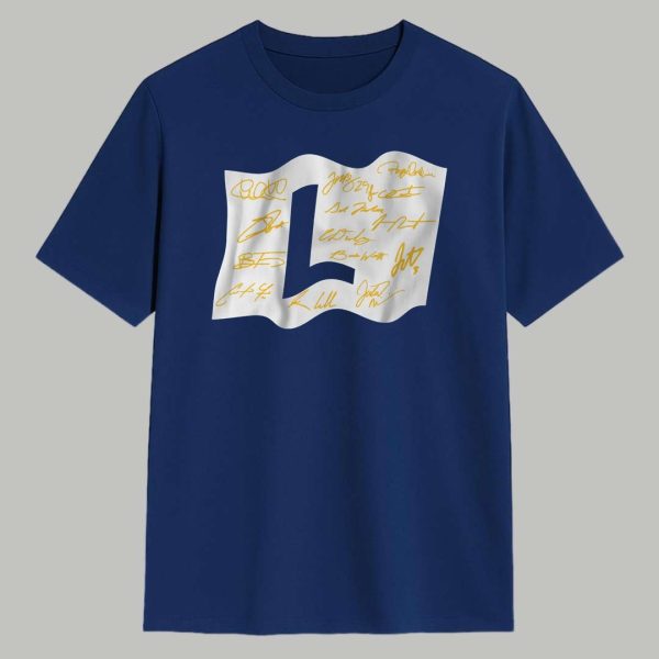 This navy blue shirt is a bold, spirited piece of fan apparel that captures the excitement and tradition of the Brewers’ biggest rivalry. The design centers on a white, slightly wavy graphic that mimics a flag being flown. Dominated by a large, prominent ‘L’ in gold, the image is a clear, unmistakable declaration of a successful day against the competition. Surrounding the large ‘L’ are abstract lines of gold script and signatures, lending the look of a celebrated, autographed memento—perhaps a signed scorecard or game ball—by key figures from a victorious team. The combination of the classic navy background, the clean white flag graphic, and the victorious gold accents creates a high-contrast, eye-catching look. This shirt is more than just a piece of casual wear; it’s a symbolic garment. It embodies the competitive fire, the shared humor, and the pride that comes with winning key matchups against historic rivals. Wearing this shirt is a simple, potent, and universally understood way to celebrate Milwaukee’s success and take part in a cherished baseball custom.