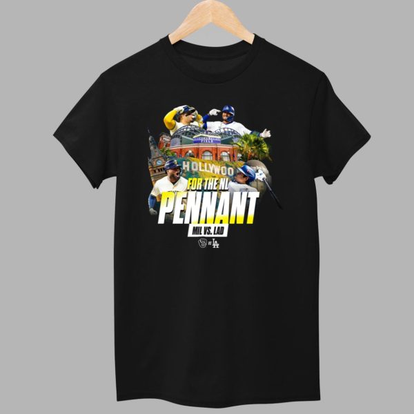 This black shirt is a dynamic and colorful tribute to the highly anticipated series between the Milwaukee and Los Angeles ballclubs. The central graphic is a vibrant collage that captures the atmosphere and rivalry of the matchup. Key players from both teams are featured in action and celebration, embodying the competitive fire of the series. The background subtly integrates iconic imagery from both Milwaukee and Los Angeles, signifying the cities’ battle for bragging rights. Boldly displayed across the center is the phrase “HOLLYWOOD FOR THE NL PENNANT” with the ultimate prize, “PENNANT,” dominating the foreground in a triumphant font. Beneath the main graphic, the teams are represented with the concise text “MIL VS. LAD” along with their respective logos, clearly defining the high-stakes matchup. This shirt is more than just casual fan wear; it embodies the intense drama, the competitive energy, and the championship aspirations of two great teams colliding for the right to play for the title. Wearing it is a declaration that you recognize the magnitude of this series and appreciate the excellence of the game.