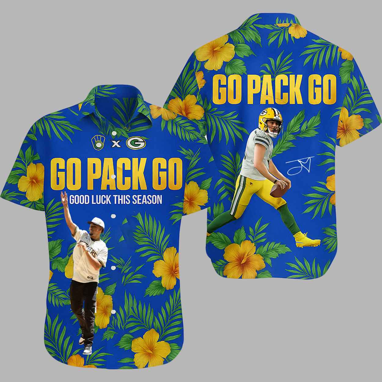This vibrant and eye-catching Hawaiian shirt features a lively blue background with an all-over tropical pattern of green palm fronds and bright yellow hibiscus flowers. The design beautifully merges the two sports: the front features an image of a baseball player and the words “GO PACK GO” and “GOOD LUCK THIS SEASON.” The back of the shirt features a dynamic image of a Green Bay Packers quarterback in action, with the same “GO PACK GO” slogan. A small logo of a baseball and a football is also included, symbolizing the unique collaboration.