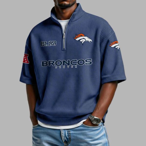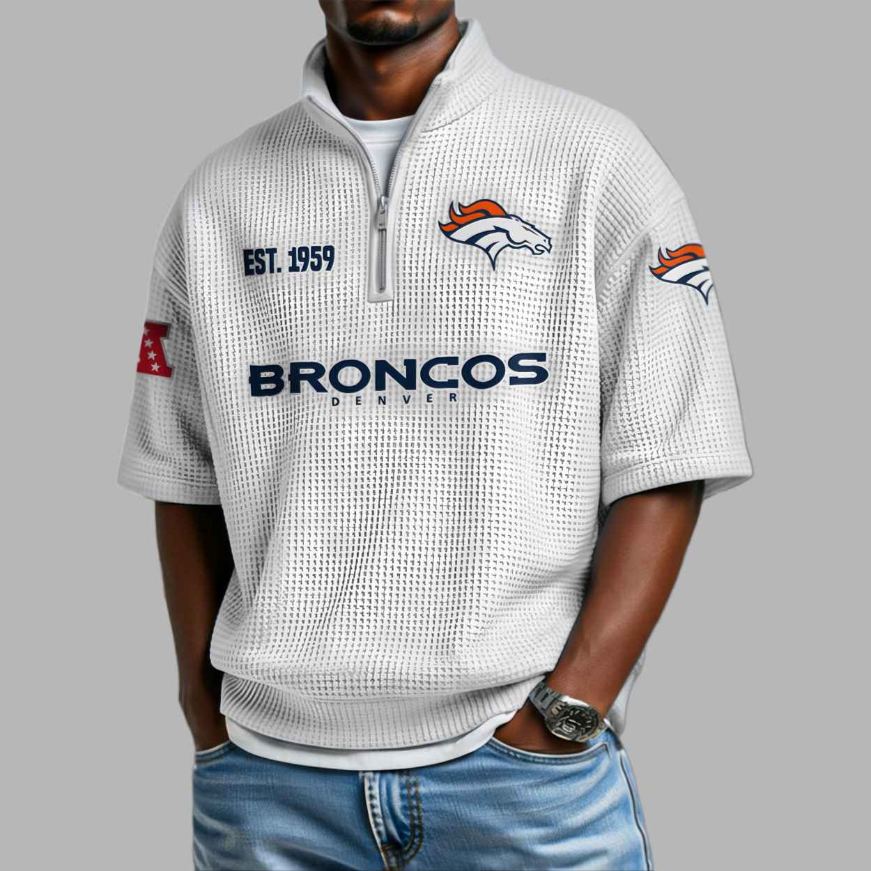 This textured navy blue quarter-zip shirt features a modern waffle-knit aesthetic that perfectly highlights the team’s iconic orange and white accents. The chest proudly displays the fierce bronco logo alongside the historic “EST 1959” founding date, while bold “BRONCOS DENVER” typography anchors the central design. This apparel is more than just a stylish top; it is a visual tribute to the resilience and deep-rooted traditions of the Denver community. Every detail, from the additional logos on the sleeves to the clean zip-up neckline, represents a connection to a long-standing heritage of passion and the relentless spirit of the West. It is a refined way to wear your loyalty while honoring a legacy that has unified fans for generations.