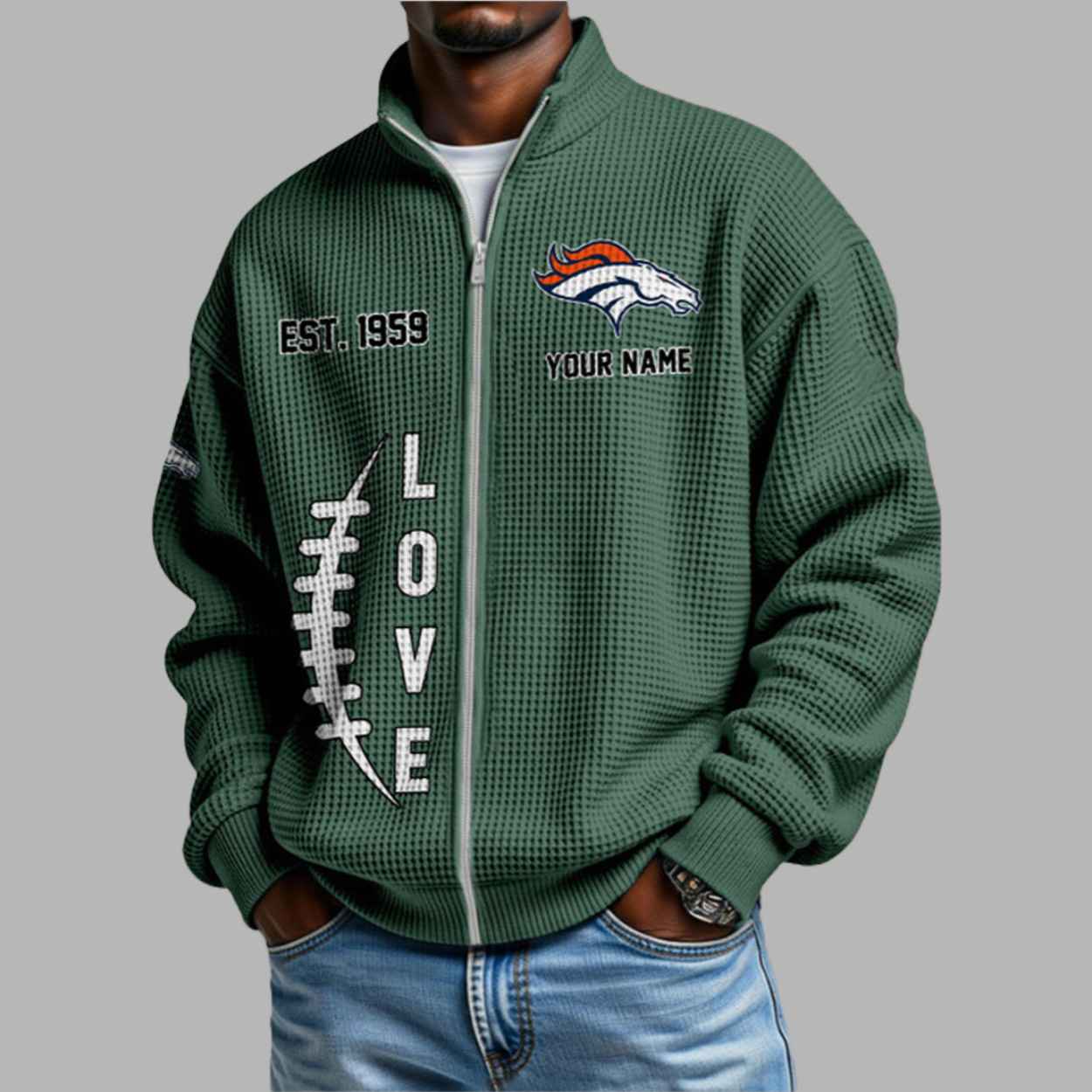 This sophisticated white sweatshirt features a modern waffle-knit texture that brings a tactile, high-end feel to your fan apparel. The design is a heartfelt tribute to heritage, prominently displaying the iconic orange and navy stallion emblem on the chest alongside “EST. 1959” to honor the franchise’s founding year. A unique vertical “LOVE” graphic, creatively detailed with football-style stitching, runs down the front, while the sleeve is finished with additional team logos for a complete, athletic look. Beyond its sharp aesthetic, this garment represents the unyielding spirit of a community that stands tall through every yard gained in the Mile High City. It is a creative masterpiece designed for those who value long-standing traditions and want to represent their lifelong passion with a sleek, professional silhouette that transitions perfectly from the stadium to your daily routine.