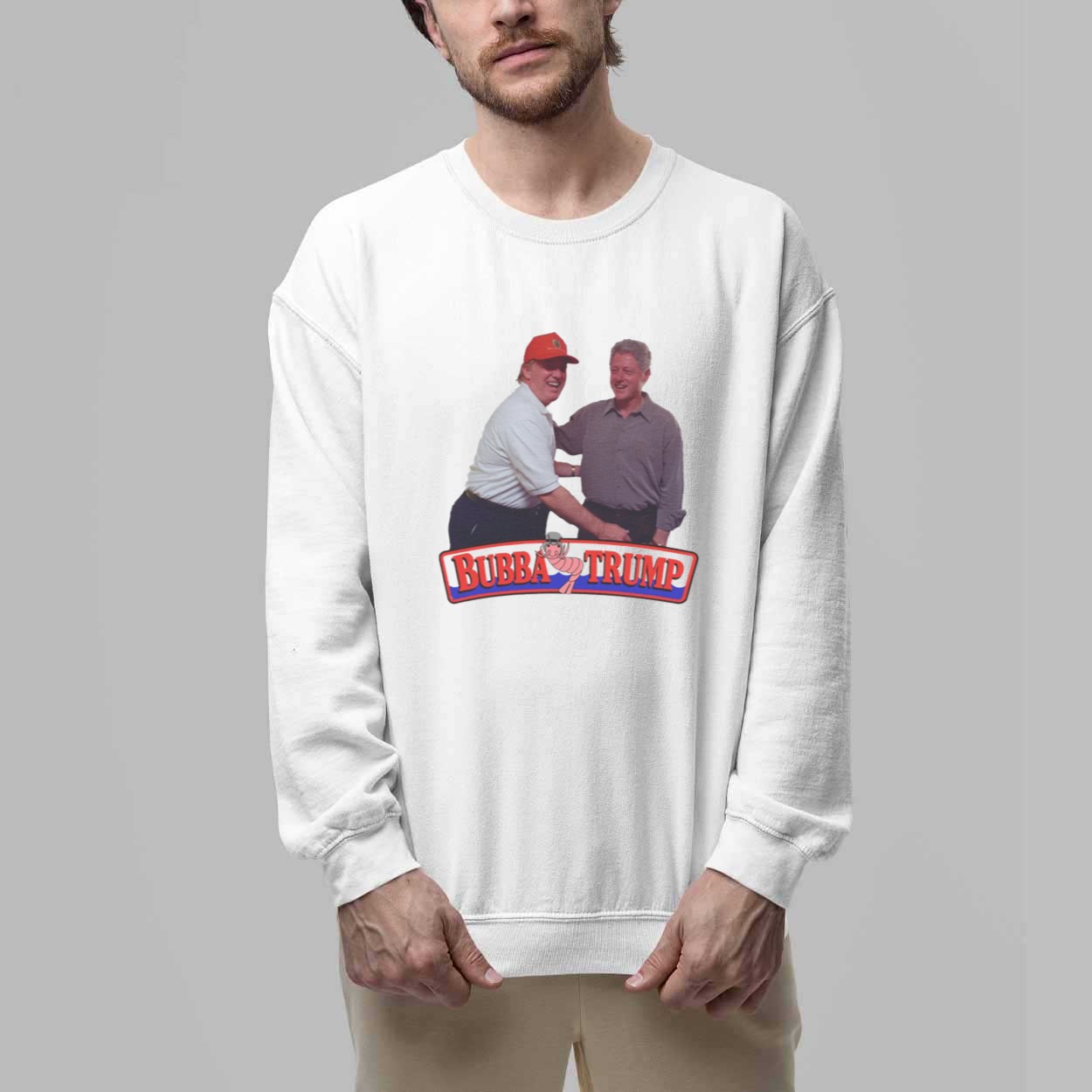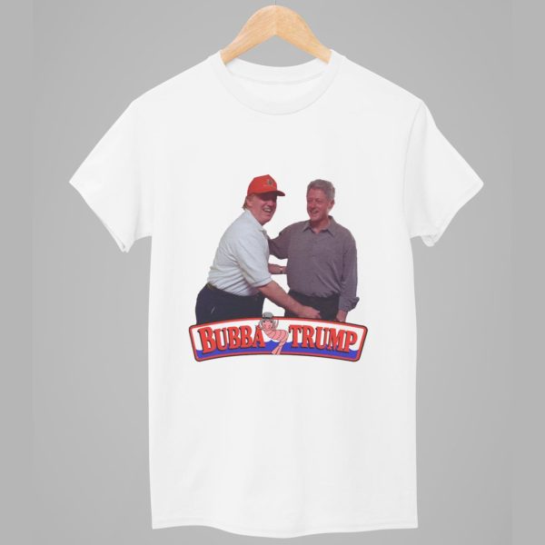 This shirt embraces a bold, meme-style aesthetic to celebrate a unique moment in modern political history. The clean, white background ensures the central graphic stands out prominently. The shirt features an iconic photograph of two highly recognizable American political figures smiling and shaking hands, a snapshot that captures a moment of shared, if unexpected, camaraderie. The image is framed by the custom-designed text “BUBBA TRUMP”, rendered in a distinctive, retro, cartoon-style logo that heightens the humorous, pop-culture feel of the piece. The design’s simplicity is intentional, focusing all attention on the ironic juxtaposition of these two figures. This shirt is far more than just a piece of clothing; it’s a wearable piece of commentary on the ever-changing nature of political relationships and the fun of finding humor in the absurd realities of public life. It embodies the concept that beneath the political differences, there are moments of shared human connection, transforming a simple garment into a comfortable, immediate symbol of political wit and self-aware commentary. It speaks to those who enjoy political satire and the often-surprising twists of the public stage.