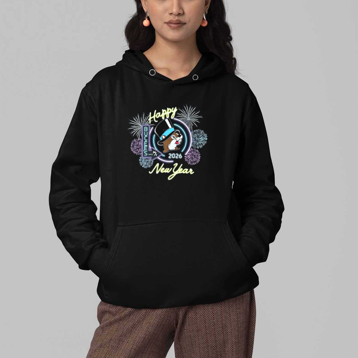 This festive black t-shirt features a dynamic neon-inspired design that perfectly captures the excitement of a midnight countdown. The center graphic showcases the iconic beaver mascot wearing a stylish blue-banded top hat, framed by a glowing “Happy New Year” script and colorful fireworks in shades of purple, blue, and white. A nostalgic neon sign detail reminds fans that the joy is “Open 24/7,” while the year 2026 is displayed prominently to mark a new chapter of adventures. Beyond its bright aesthetic, this garment symbolizes a sense of community and the shared optimism of stepping into a brand-new year with a friendly, familiar face. Every detail, from the whimsical sparks to the cheerful mascot, is designed to bring a smile to your face and a glow to your holiday celebrations. It is a wearable souvenir of a milestone moment, blending travel-stop charm with a high-energy party atmosphere.