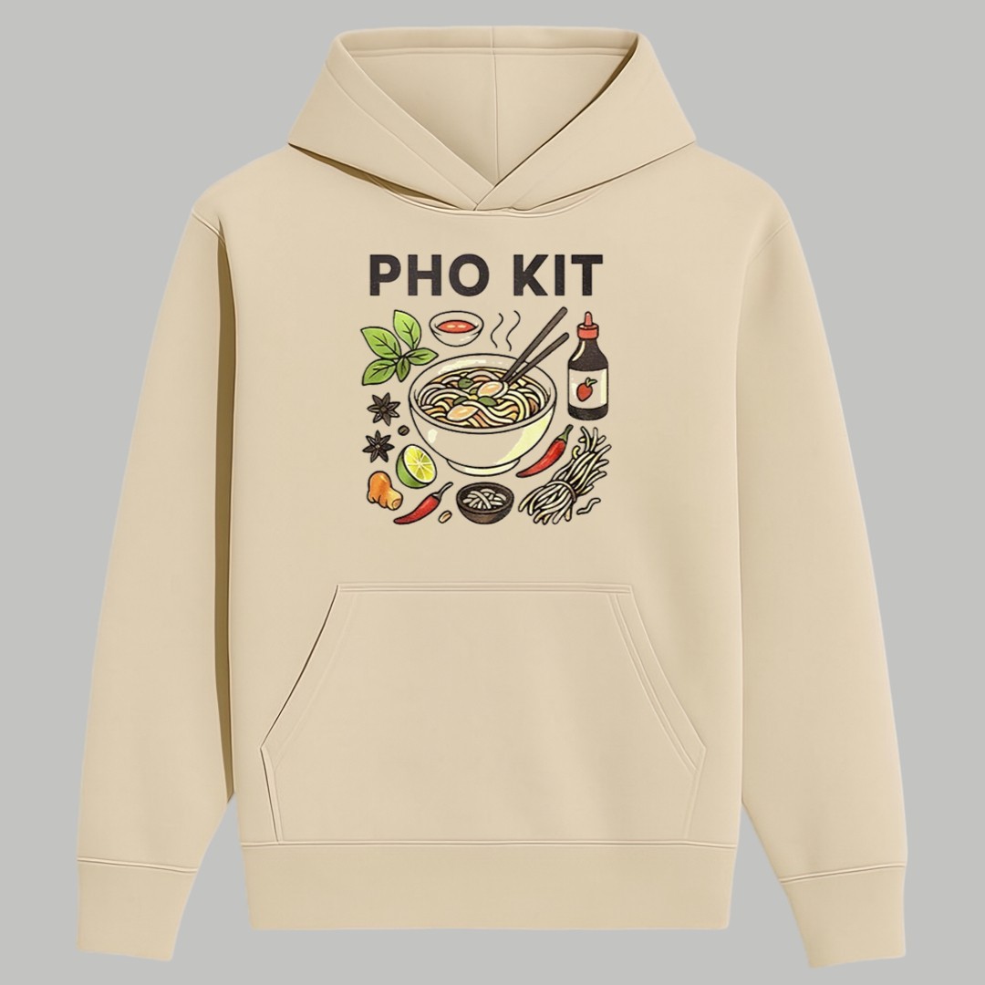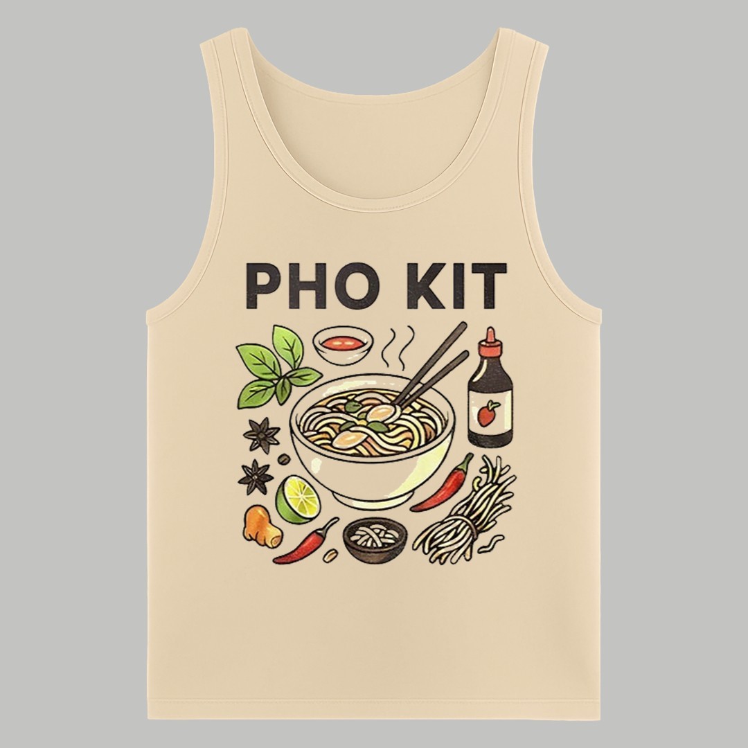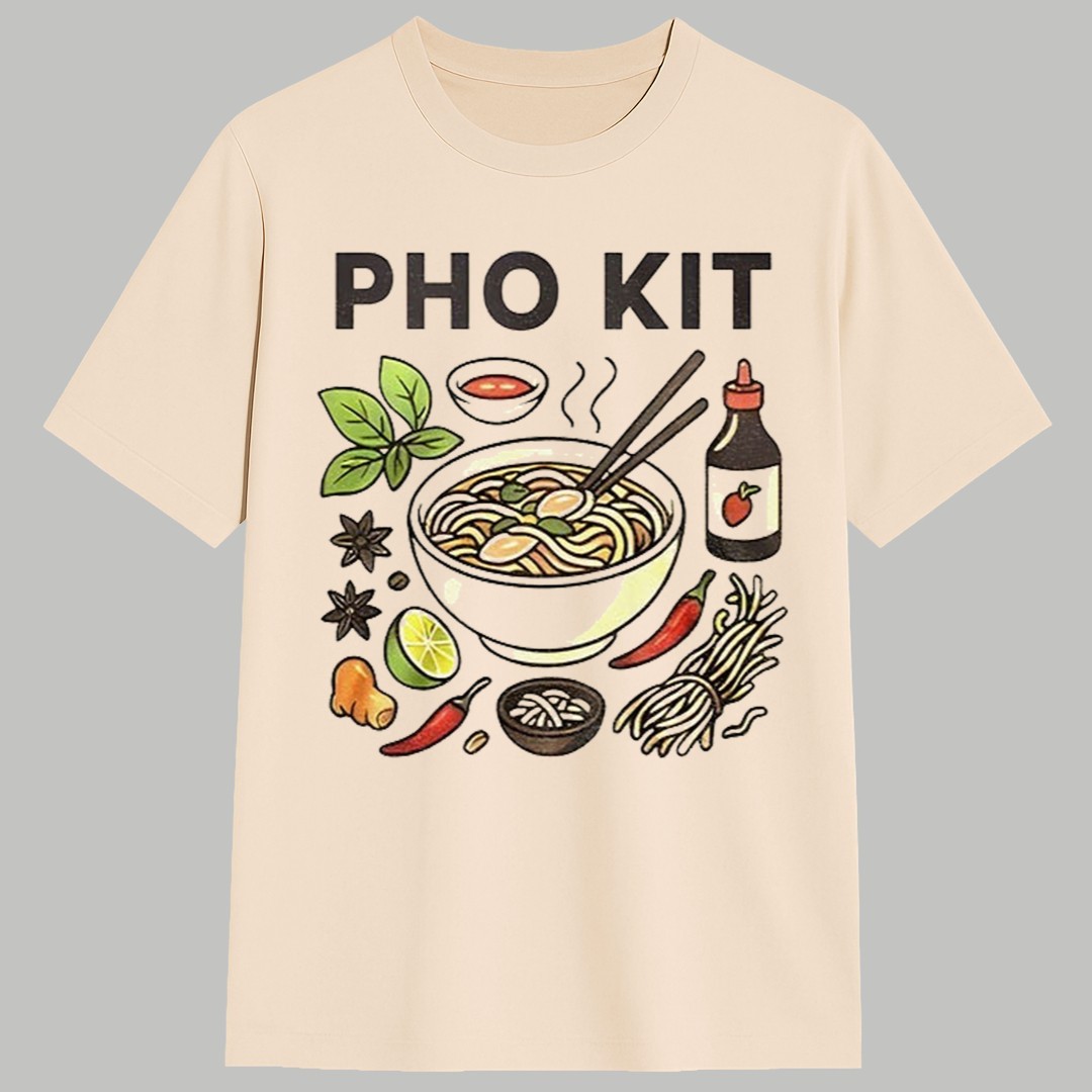 The front of the shirt features a powerful and stylish graphic that celebrates a monumental dish. A detailed illustration of a bowl of Pho, complete with chopsticks and fresh herbs, is prominently displayed. Surrounding the bowl are all the components of a perfect “Pho Kit”: lime, chili peppers, sauces, and star anise. The bold text “PHO KIT” is printed above the illustration, a fun, modern take on a classic meal. This shirt serves as a tribute to the universal love for Vietnamese cuisine and the growing foodie culture that celebrates it. It’s a wearable symbol of a fan’s dedication to a great meal and a fun, lighthearted take on a serious message.