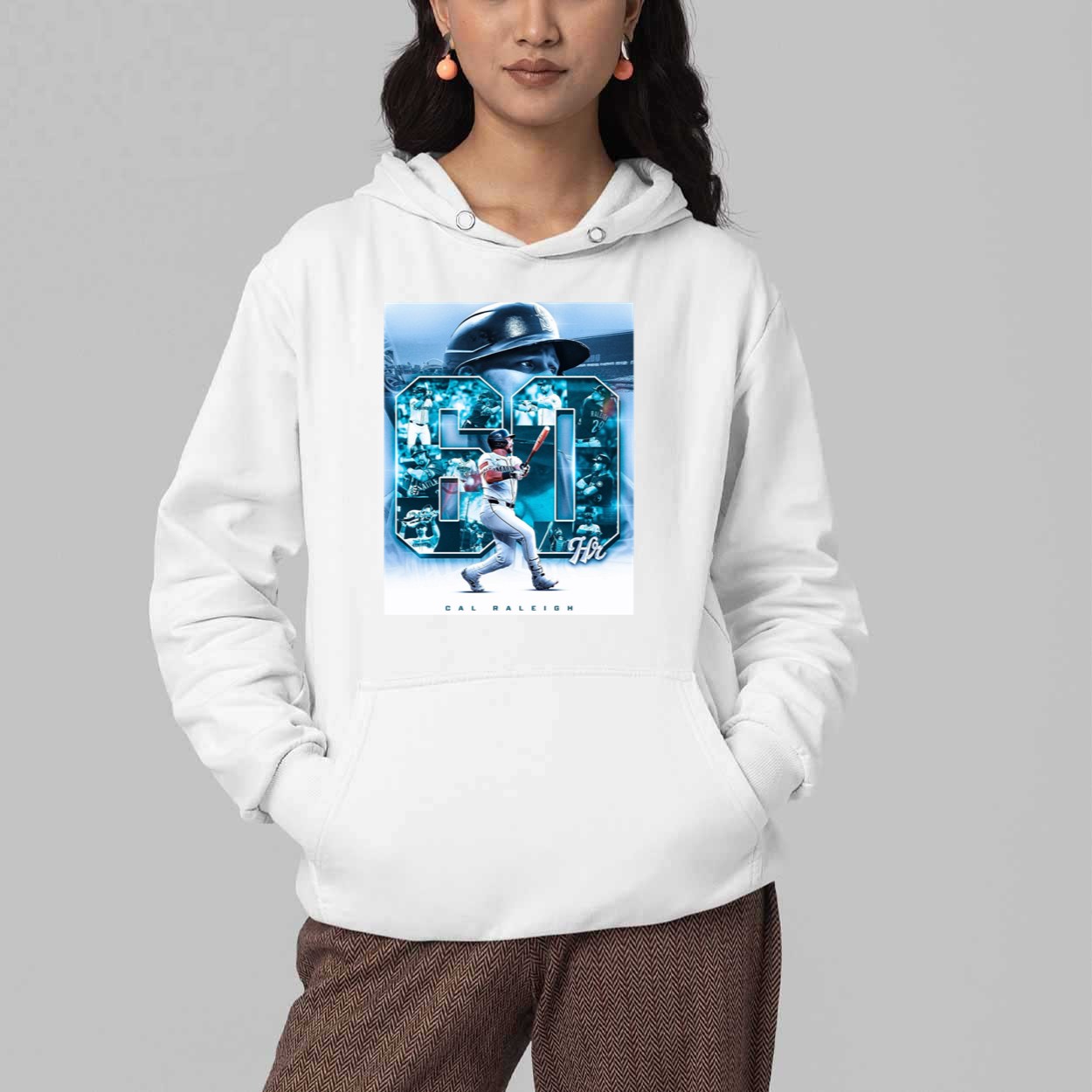 The front of the shirt features a powerful graphic that celebrates a monumental achievement. A dynamic collage of images of Cal Raleigh, both in action and in portrait, is arranged to form the bold, white number “60,” with a stylized “HR” graphic next to it. The text “CAL RALEIGH” at the bottom firmly places the shirt in the heart of Mariners fandom. This shirt serves as a tribute to Raleigh’s impressive hitting statistics and his status as a key leader for the team. It commemorates the feeling of pride that every fan feels when a player reaches a milestone of this magnitude, and it’s a wearable symbol of his incredible talent and dedication.
