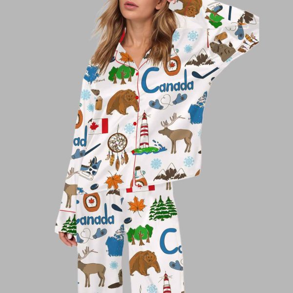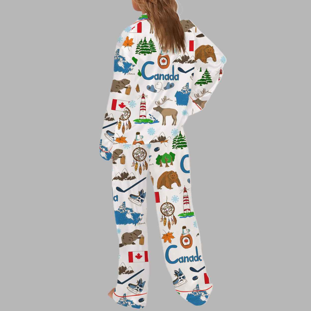 This exquisite pajama set captures the essence of Canada in a vibrant, whimsical, all-over print. The smooth, elegant white satin fabric serves as a clean canvas for a delightful collage of Canadian icons. The print is rendered in a charming, artistic style and includes quintessential Canadian images: the bold maple leaf, majestic moose and brown bears, towering pine trees and snow-capped mountains, lighthouses, hockey sticks and pucks, maple syrup bottles, a dreamcatcher, and subtle references to cities like Ottawa. The colors are a mix of traditional red and white, earthy greens and browns, and snowy blues, creating a charming, patriotic aesthetic. The set includes a classic long-sleeved button-down top and matching long pants, both detailed with a vibrant red piping along the collar, placket, and cuffs. This red trim perfectly matches the national color and adds a refined, contrasting touch to the white satin. The silky texture ensures a smooth, flowing fit, perfect for lounging or drifting off to sleep. This set is far more than just comfortable sleepwear; it’s a wearable celebration of Canadian culture, nature, and identity. It embodies the nation’s spirit of rugged beauty, cozy winter life, and friendly national pride, making it a comfortable, beautiful symbol of home, travel, or appreciation for all things Canadian.