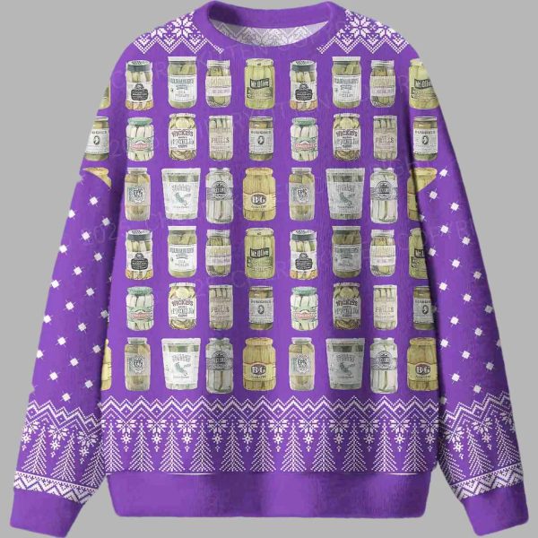 This spectacularly unique sweater takes the ugly Christmas sweater tradition and gives it a delightfully crunchy twist. The main body of the garment features a vibrant, repeating pattern of assorted canned pickles in jars, perfectly showcasing a love for this tangy snack. The design is set against a bold, eye-catching purple background, framed by classic white holiday patterns, including snowflakes and traditional Nordic-style motifs along the sleeves and hem. This piece is more than just clothing; it’s a humorous homage to the often-overlooked holiday tradition of the Christmas Pickle ornament, bringing that quirky spirit to the forefront. It’s a perfect visual pun and a celebratory garment for anyone who appreciates a good gherkin and wants to inject some unexpected flavor into their seasonal style. Wear it proudly to show off your great taste in snacks and your sense of humor during all your winter celebrations.